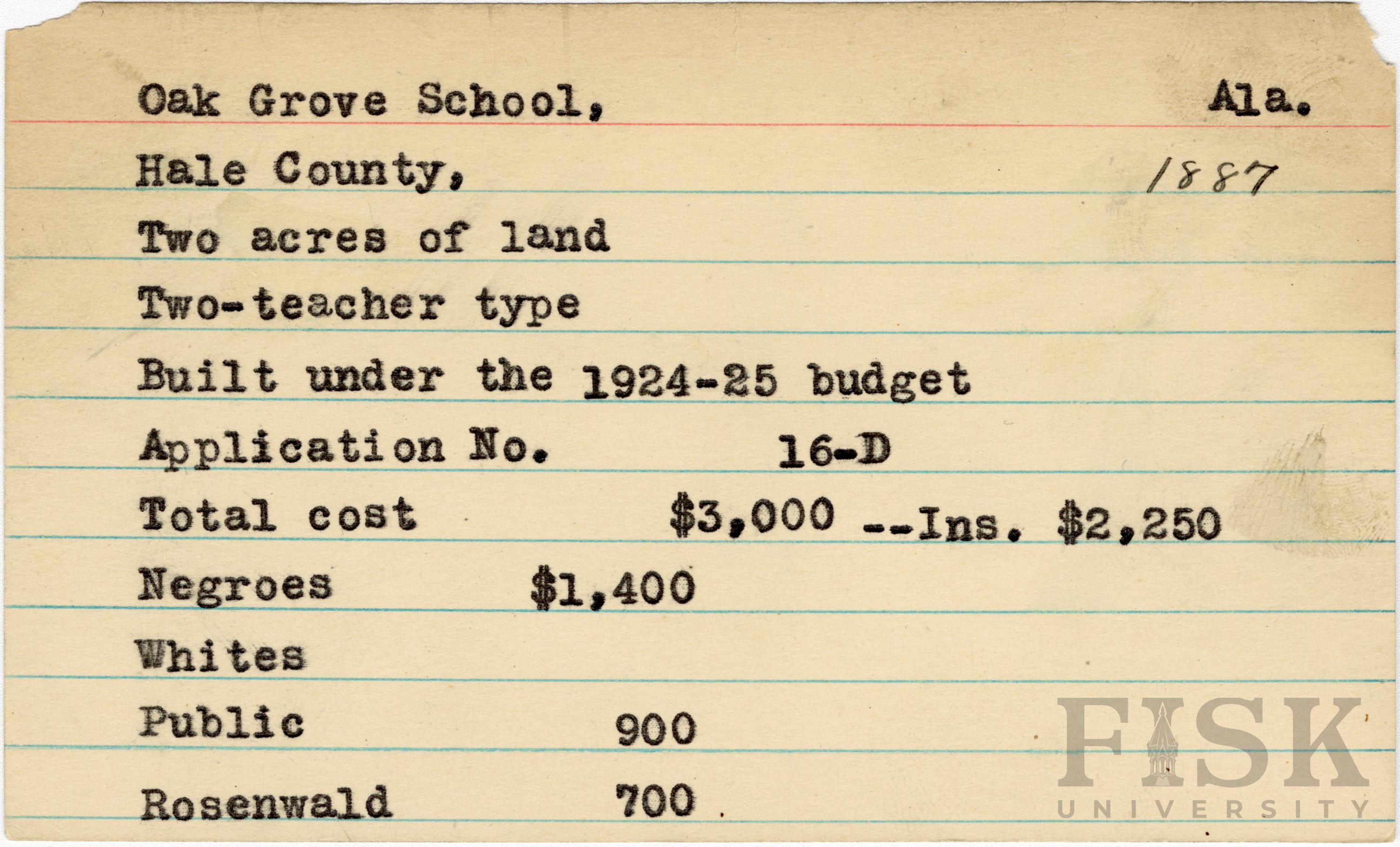 School card from Rosenwald Fund for Oak Grove School in Hale County, Alabama with a section added to budget contributions that says, "Ins. $2,250"
