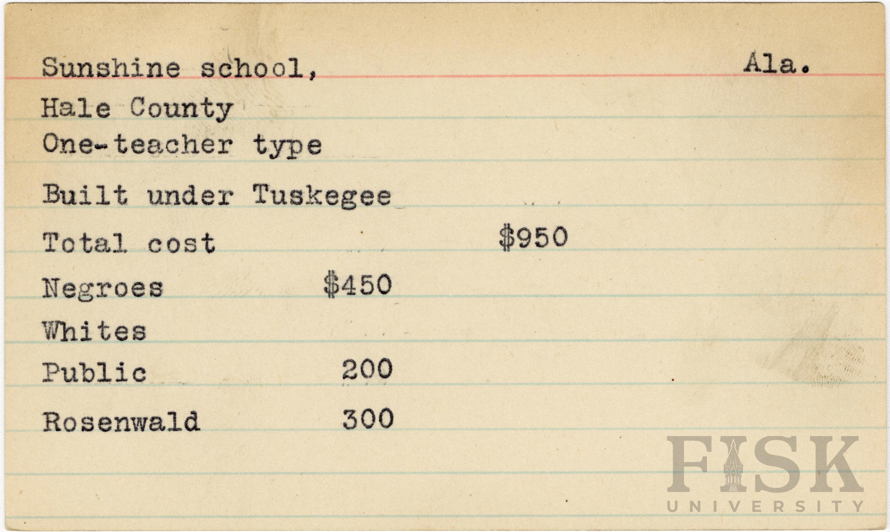 - School card from Rosenwald Fund for Sunshine School in Hale County, Alabama