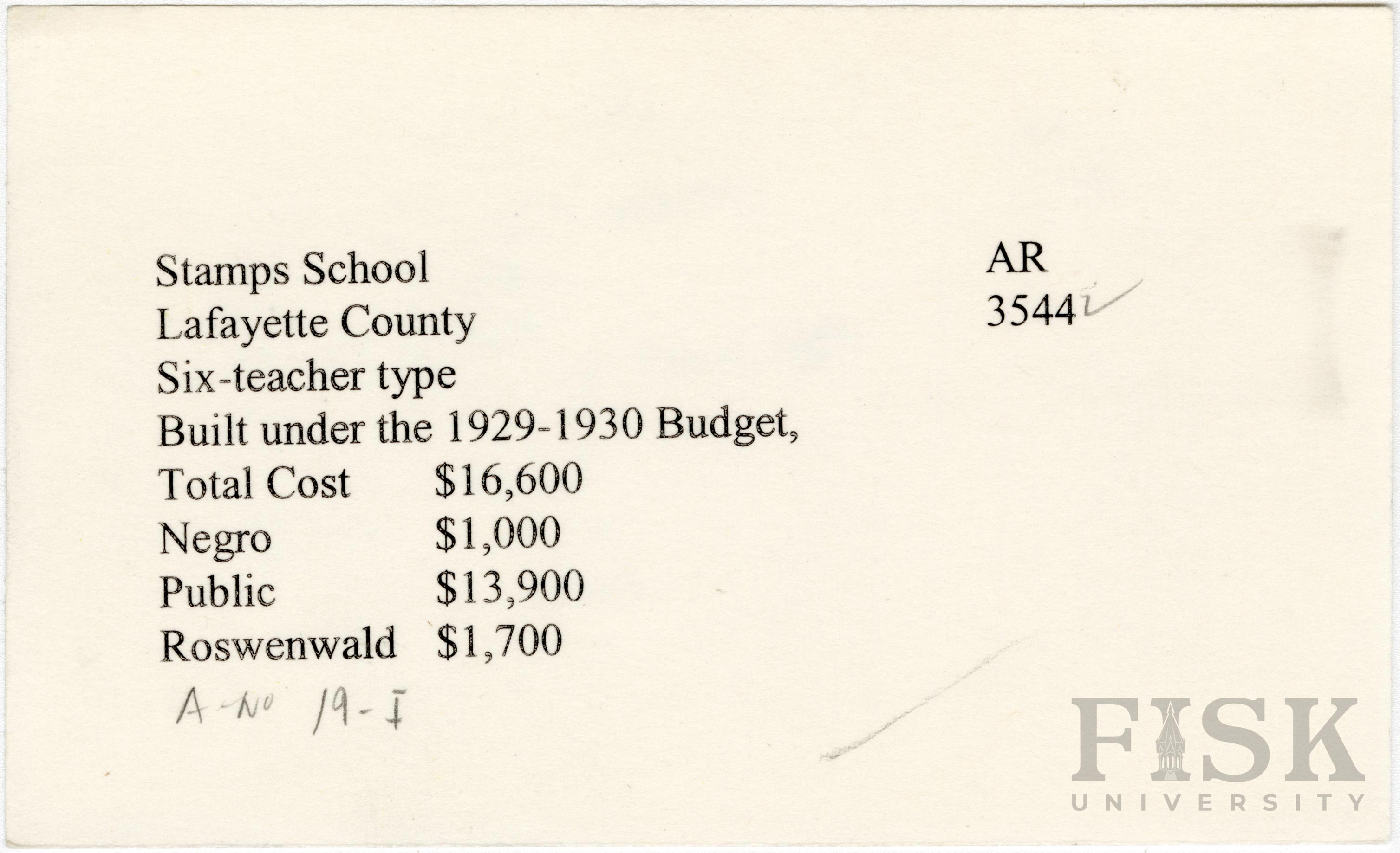 - School card from Rosenwald Fund for Stamps School in Lafayette County, Arkansas