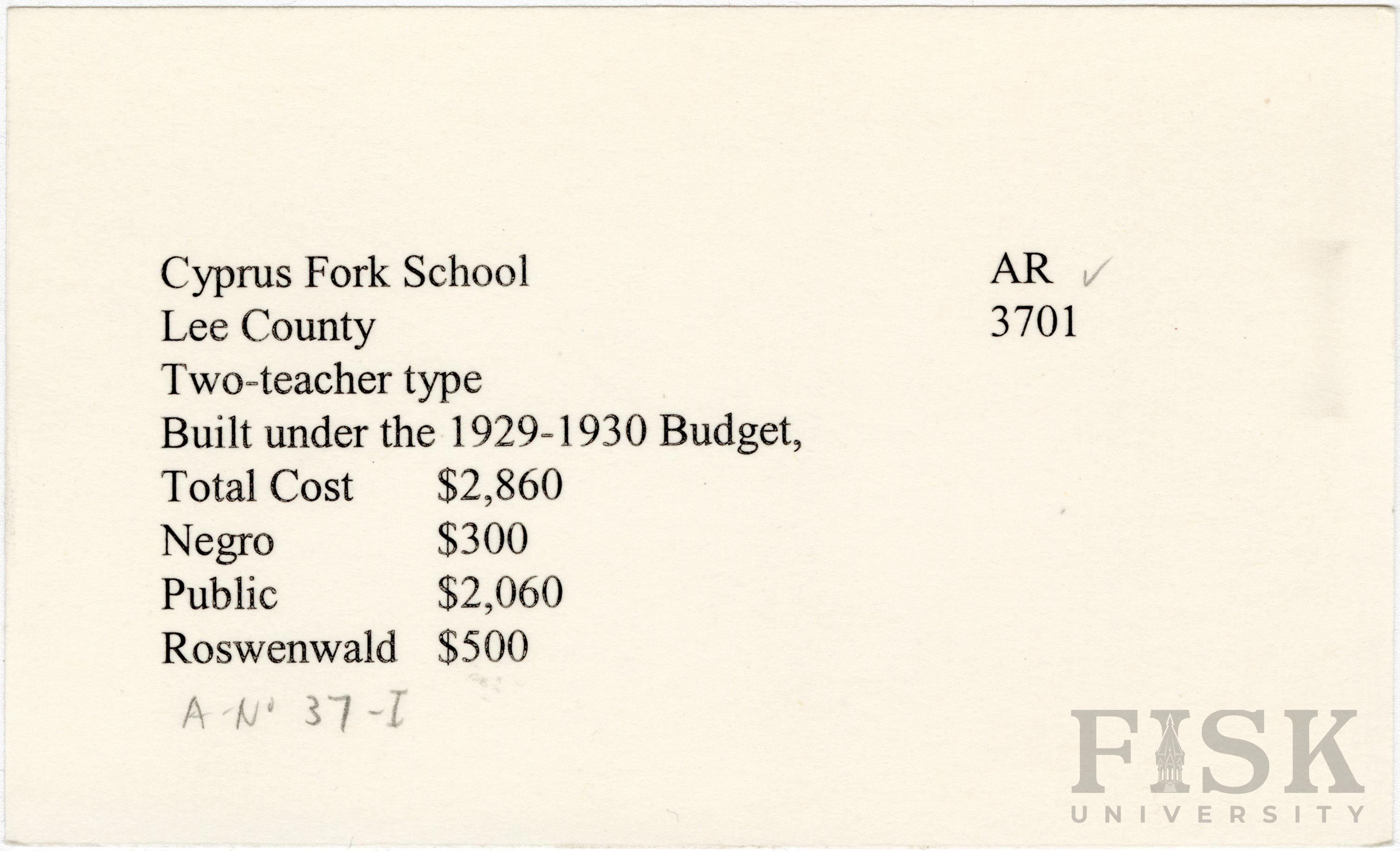- School card from Rosenwald Fund for Cyprus Fork School in Lee County, Arkansas