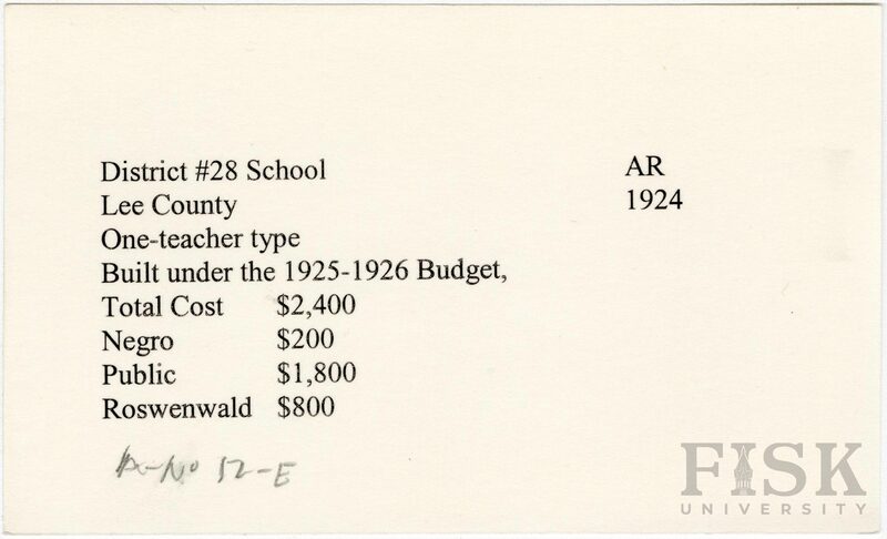 - School card from Rosenwald Fund for District No. 28 School in Lee County, Arkansas
