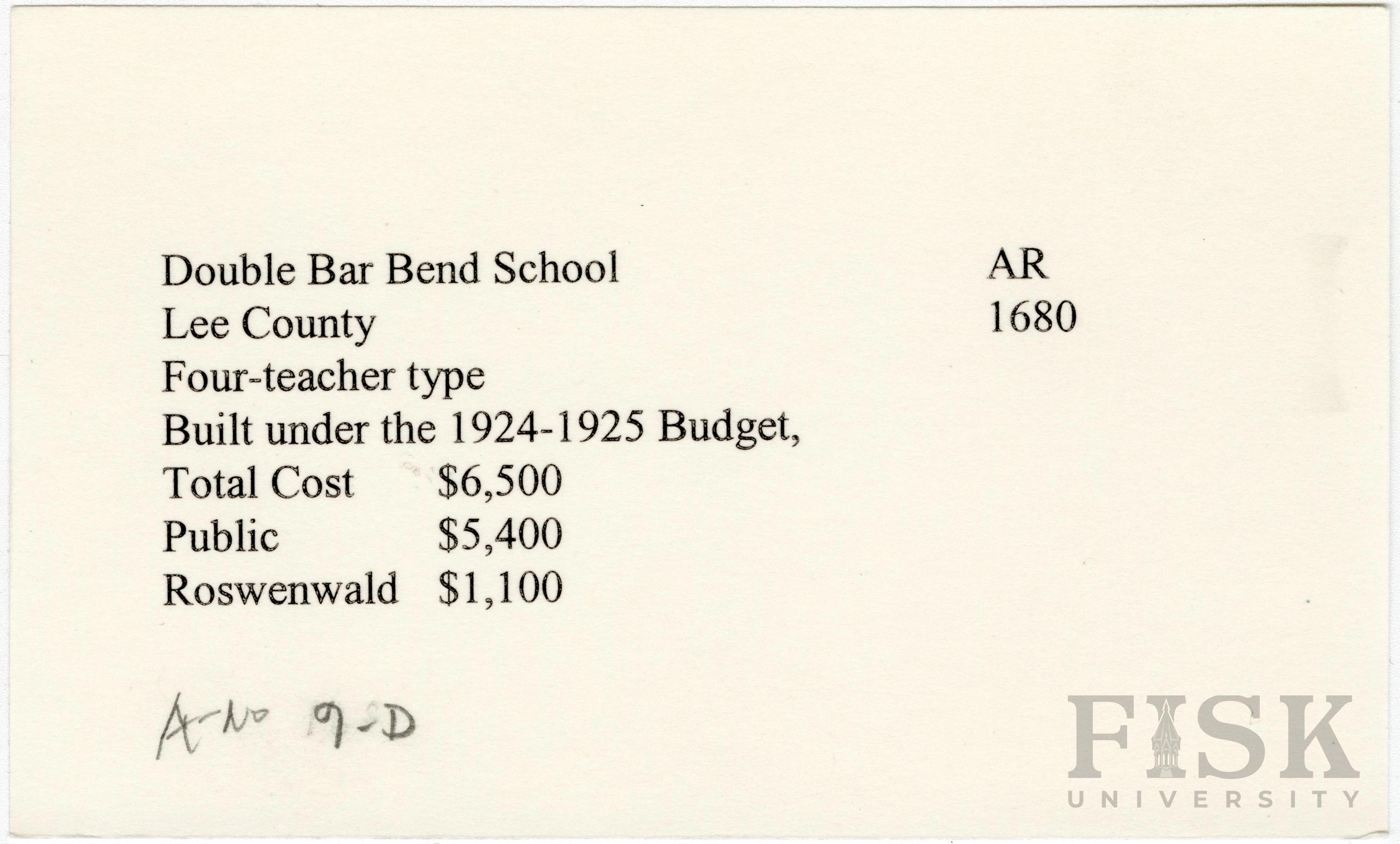 School card from Rosenwald Fund for Double Bar Bend School in Lee County, Arkansas