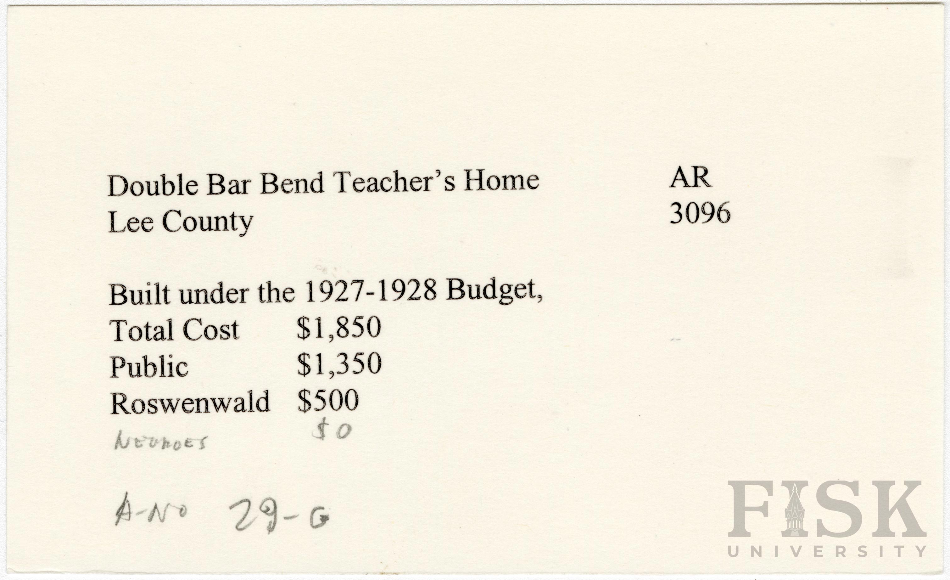 - School card from Rosenwald Fund for the teacher's home at Double Bar Bend School in Lee County, Arkansas