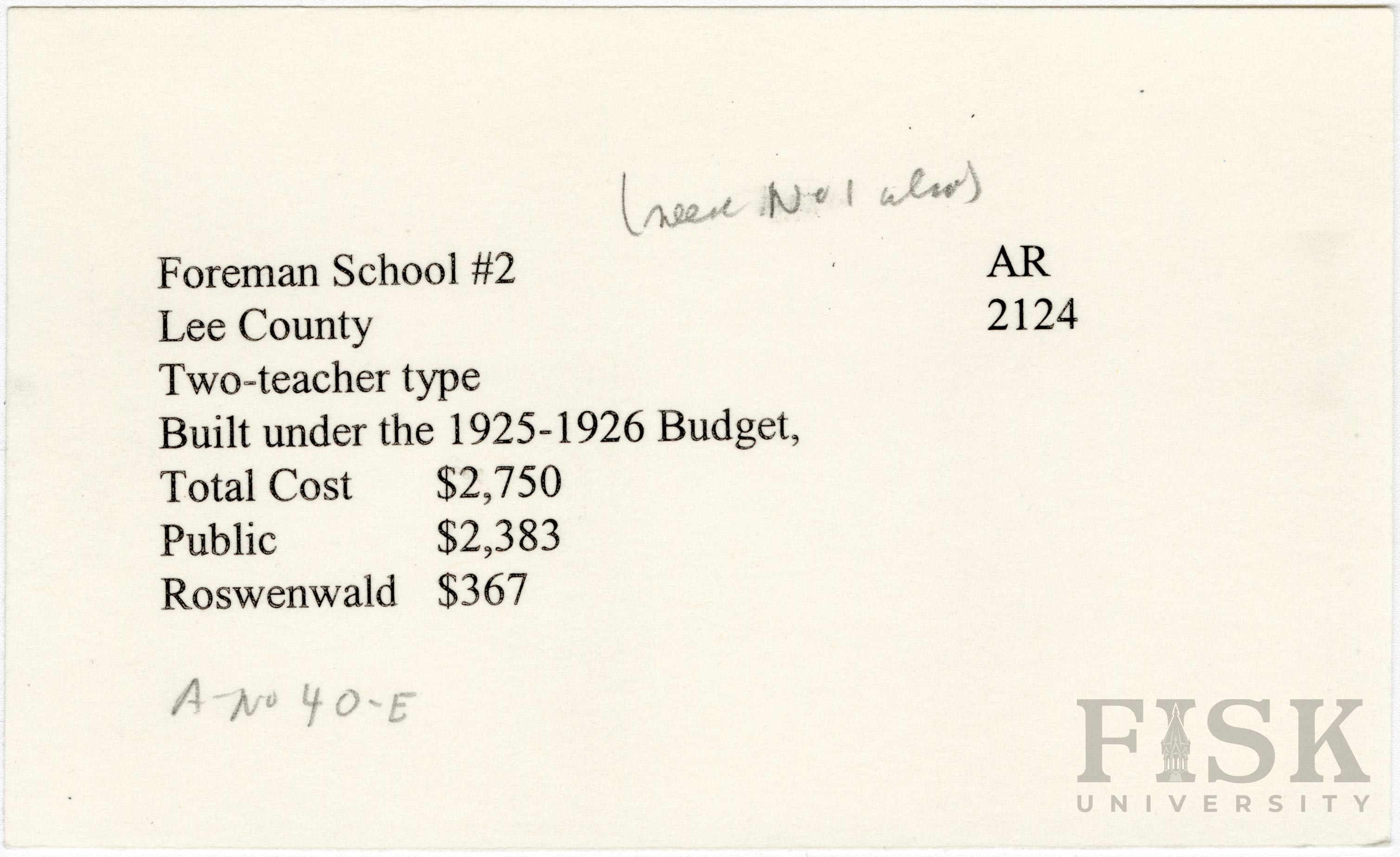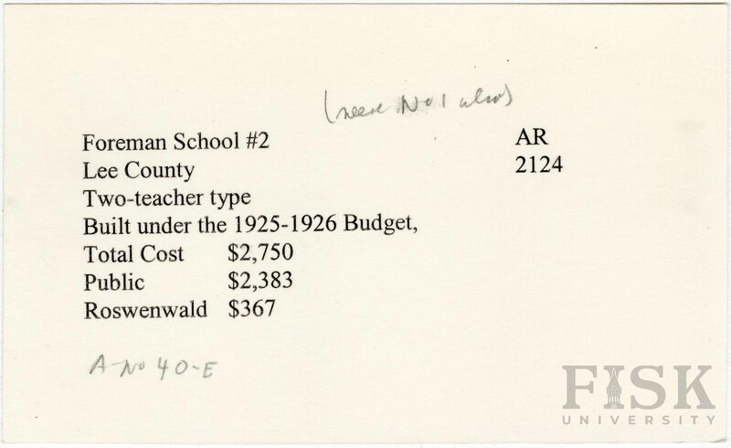 - School card from Rosenwald Fund for Foreman School No. 2 in Lee County, Arkansas with a note on the card that says, "(See No 1 also)"