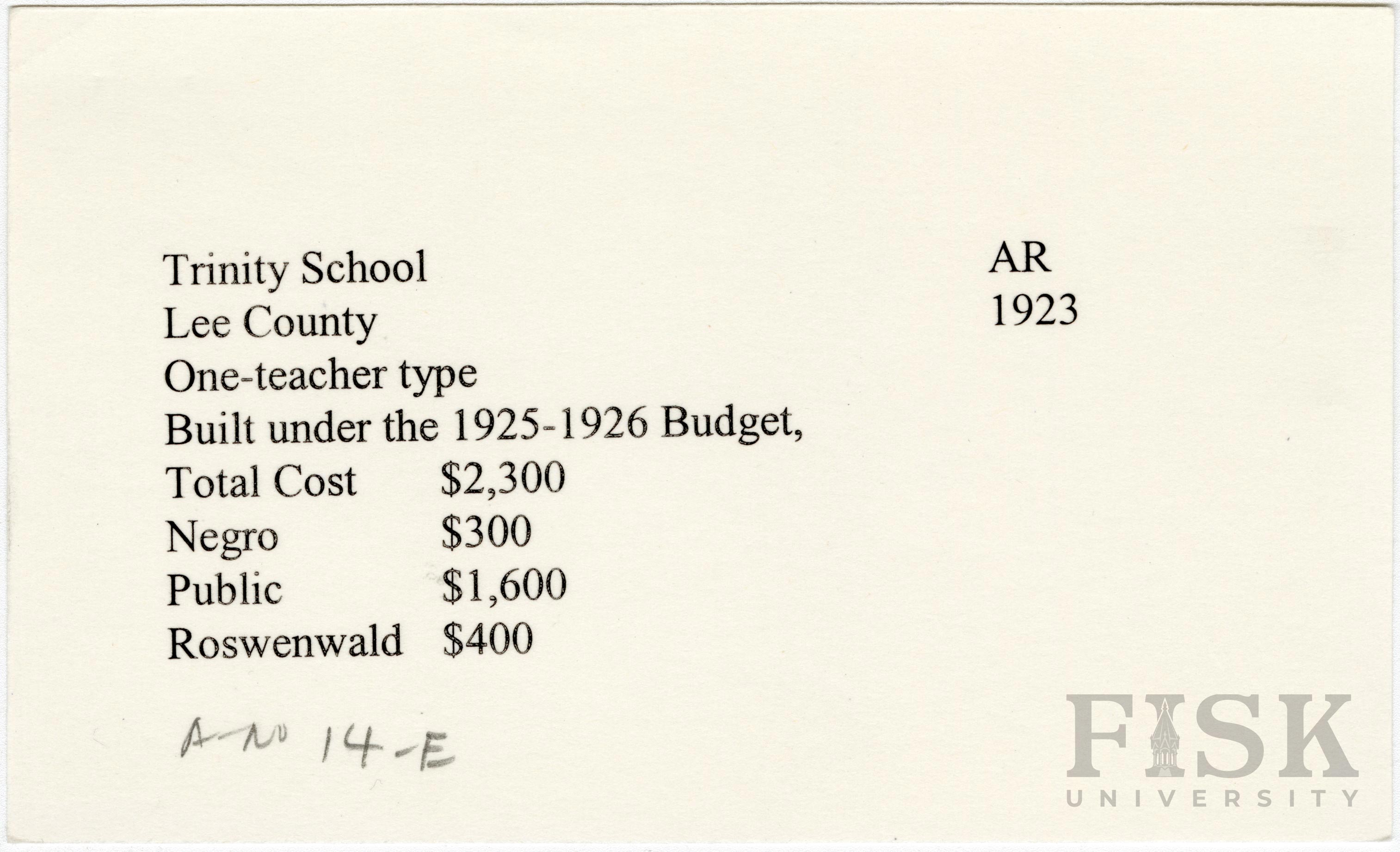 - School card from Rosenwald Fund for Trinity School in Lee County, Arkansas