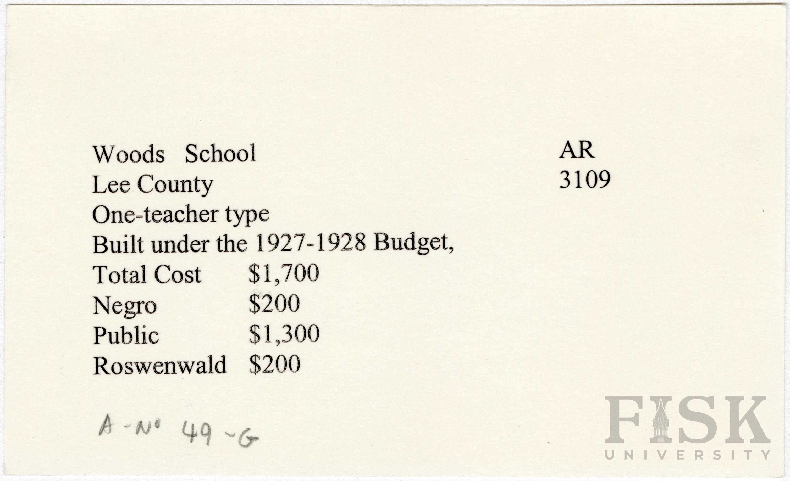 - School card from Rosenwald Fund for Woods School in Lee County, Arkansas