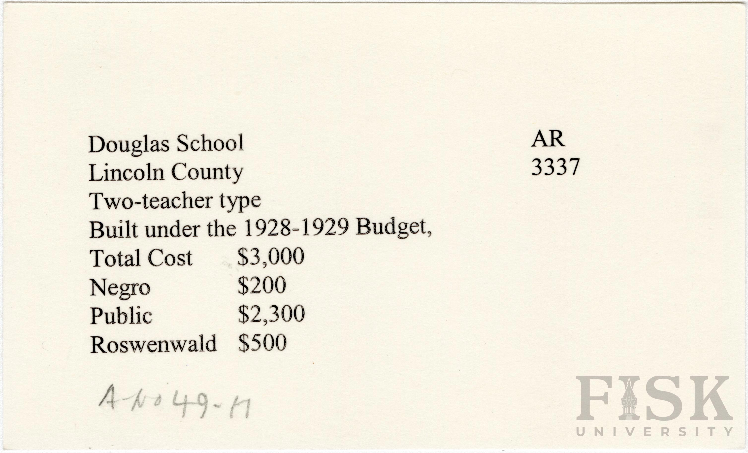 - School card from Rosenwald Fund for Douglas School in Lincoln County, Arkansas