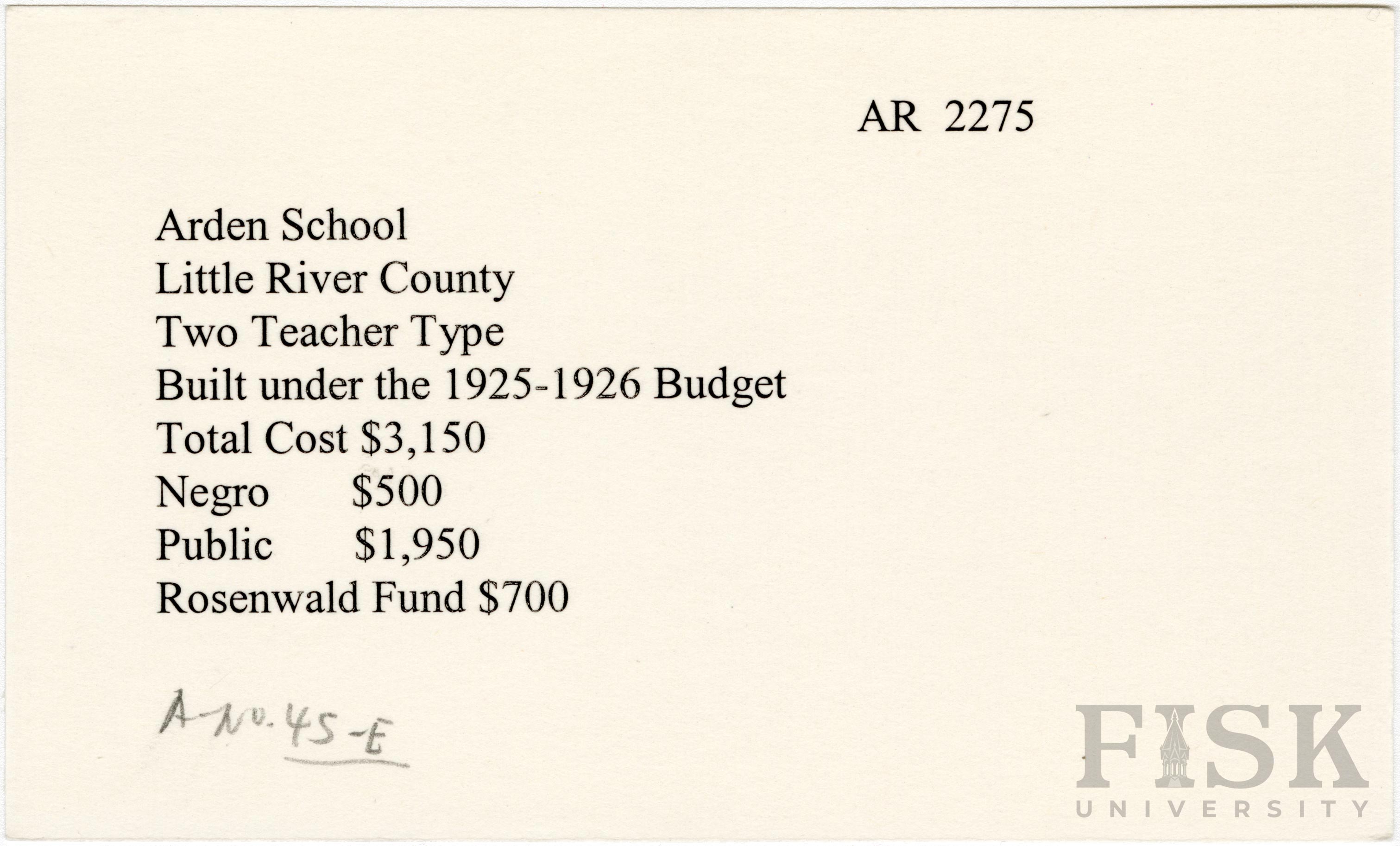 - School card from Rosenwald Fund for Arden School in Little River County, Arkansas