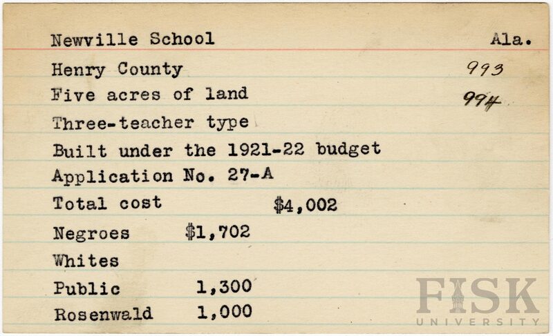 - School card from Rosenwald Fund for Newville School in Henry County, Alabama