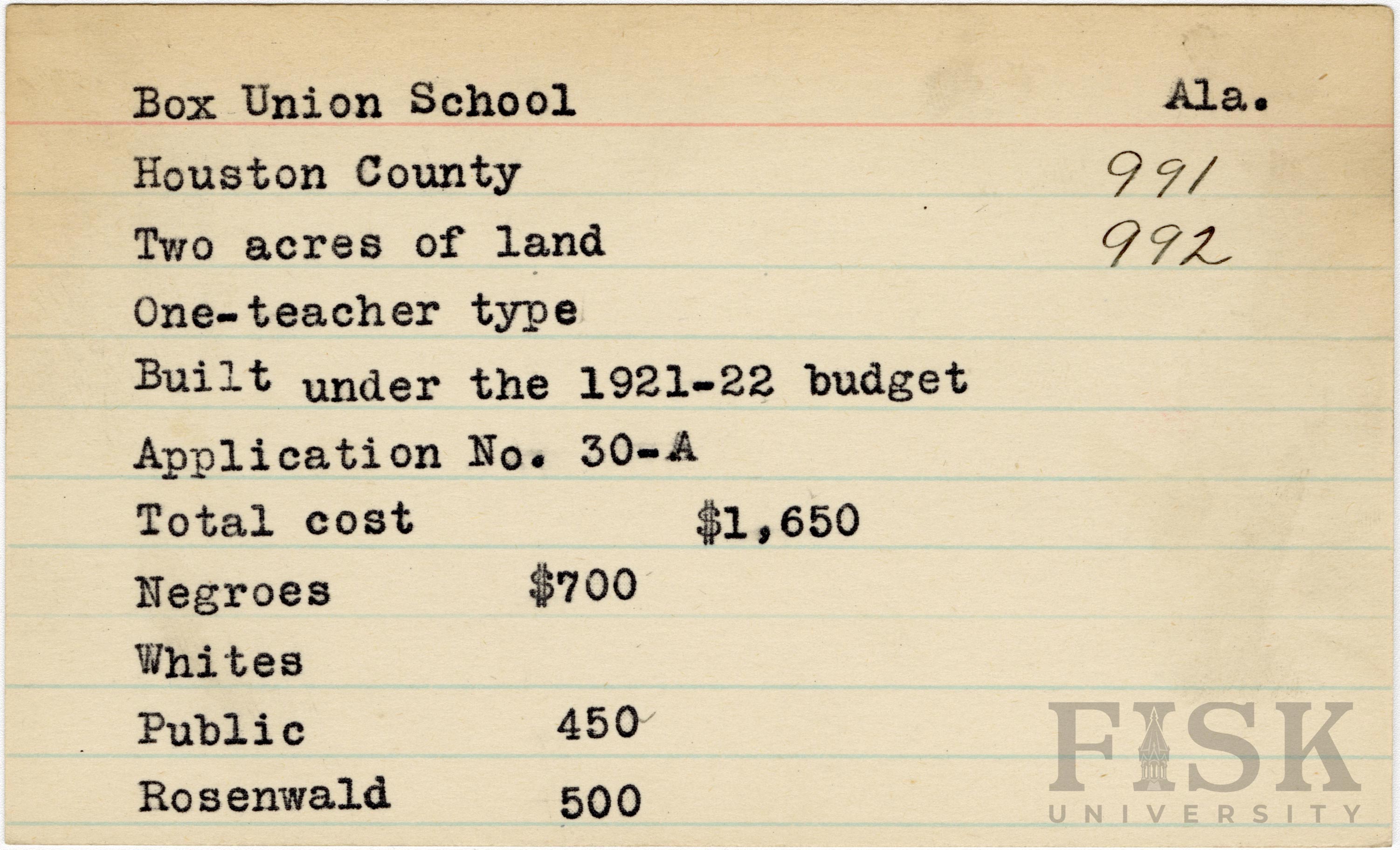 - School card from Rosenwald Fund for Box Union School in Houston County, Alabama
