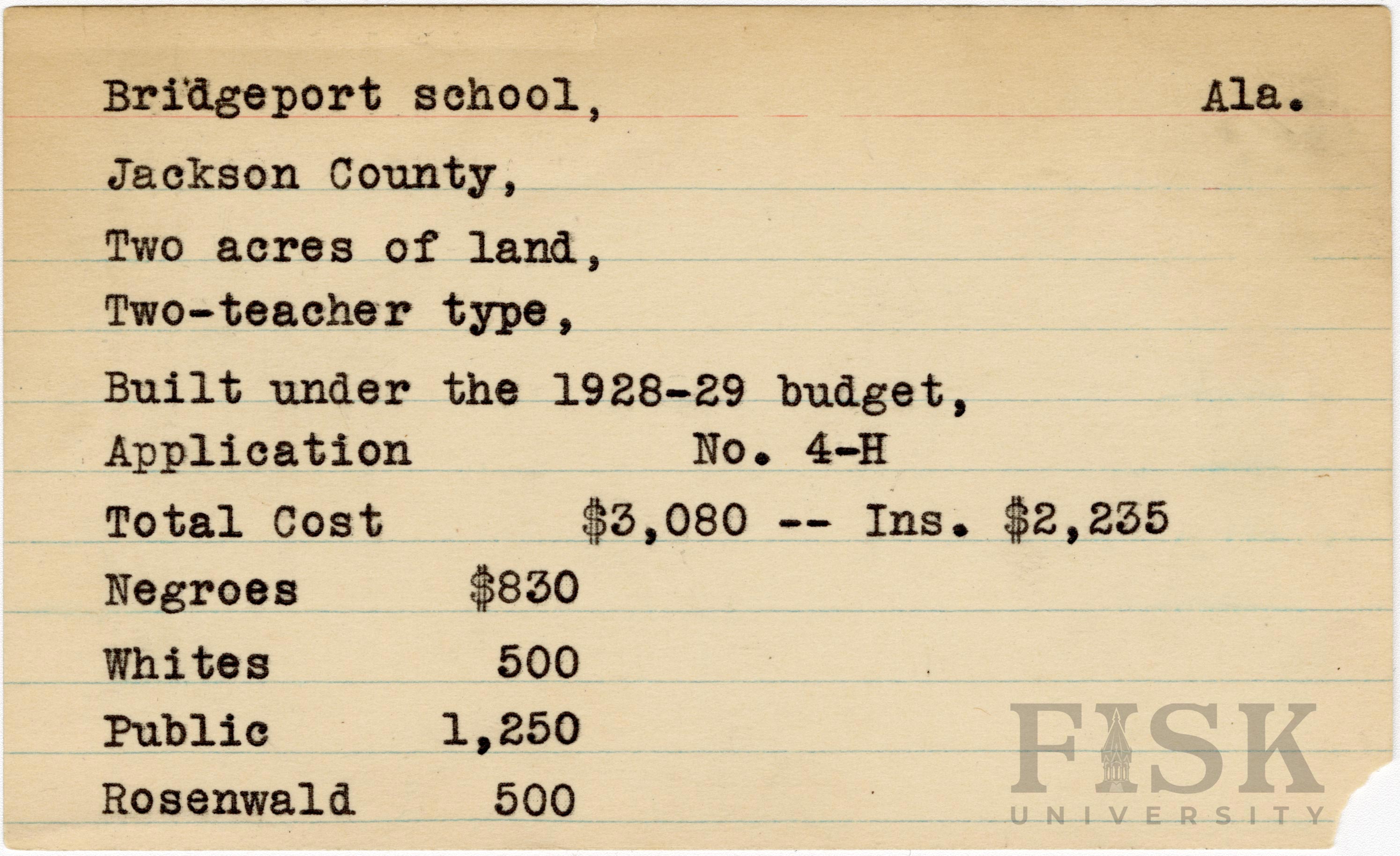 School card from Rosenwald Fund for Bridgeport School in Jackson County, Alabama with a section added to the budget contributions that says, "Ins. $2,235"