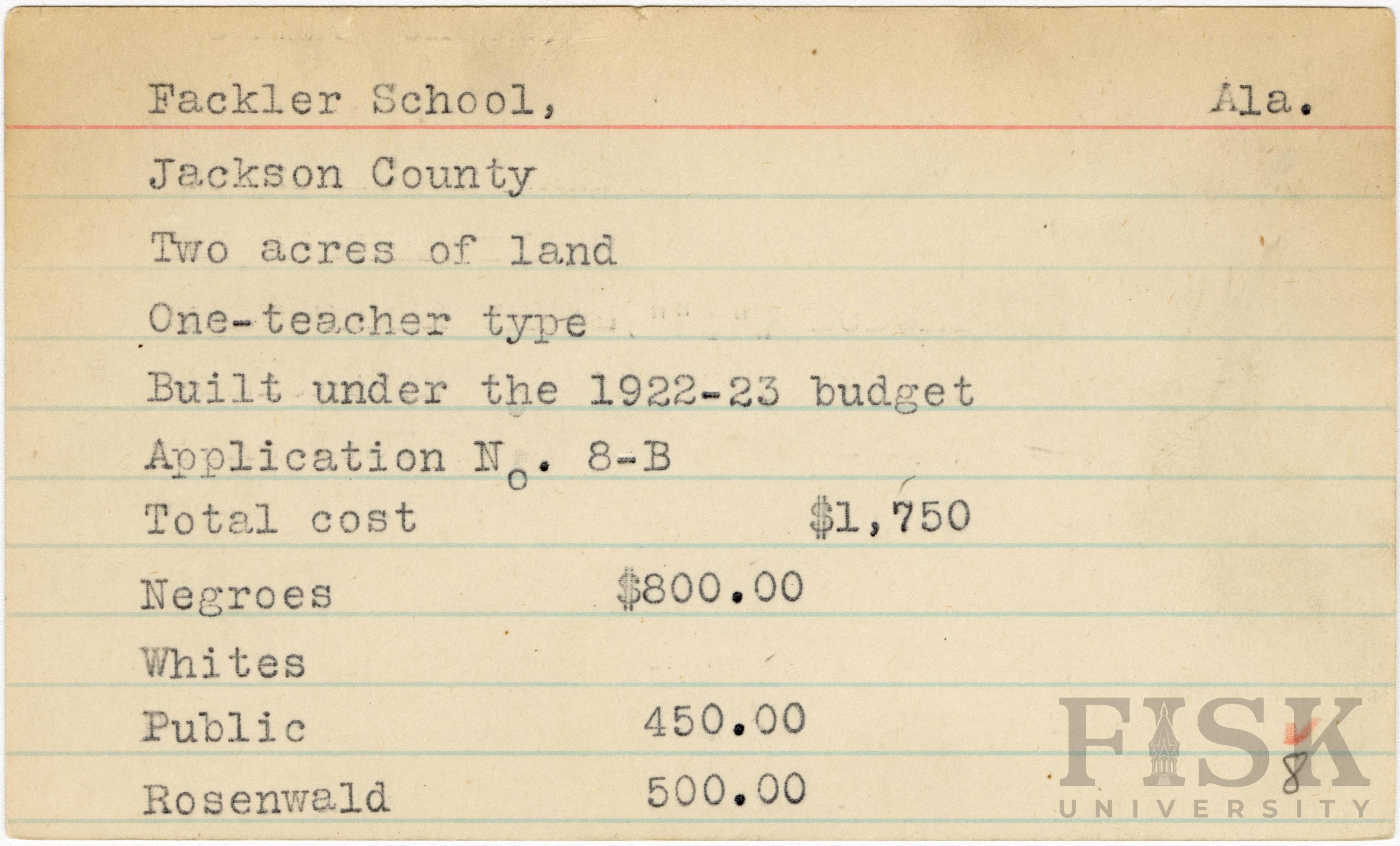 - School card from Rosenwald Fund for Fackler School in Jackson County, Alabama