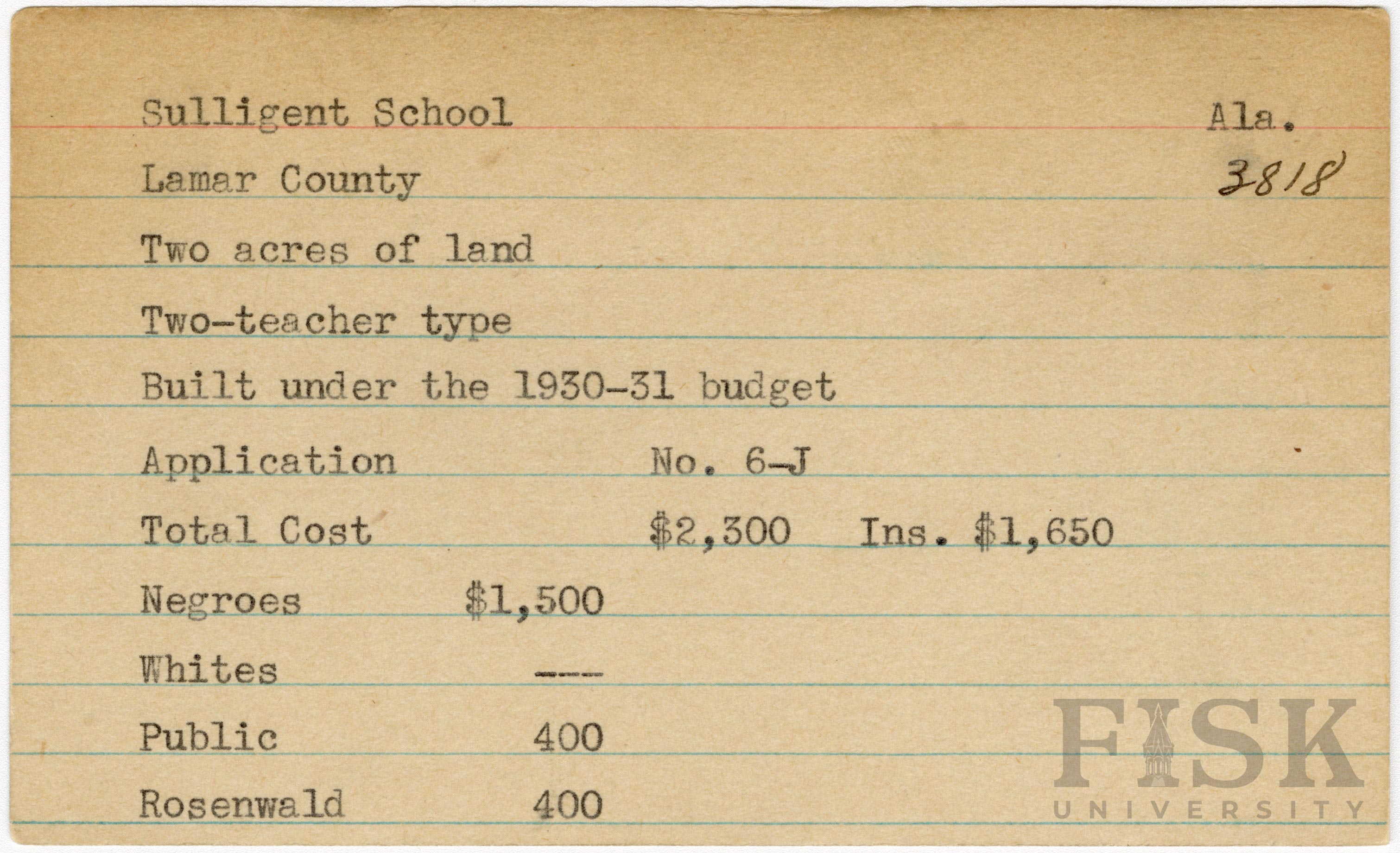 School card from Rosenwald Fund for Sulligent School in Lamar County, Alabama with a section added to the budget contributions that says, "Ins. $1,650"