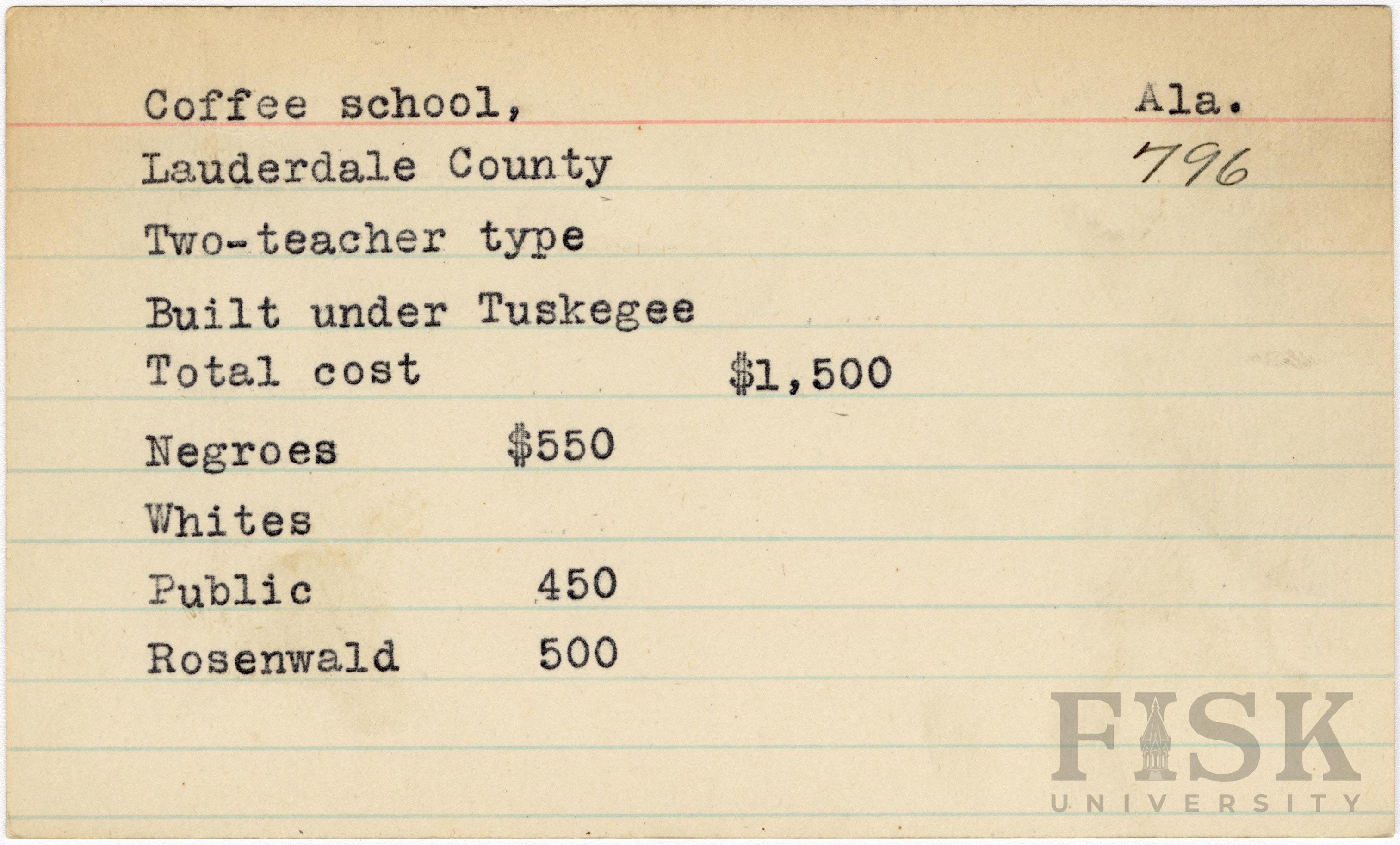 - School card from Rosenwald Fund for Coffee School in Lauderdale County, Alabama