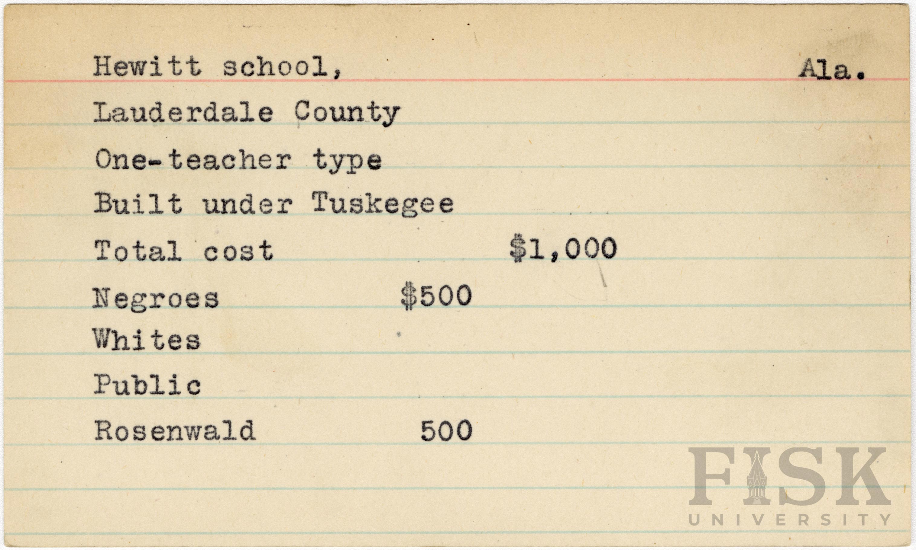 - School card from Rosenwald Fund for Hewitt School in Lauderdale County, Alabama