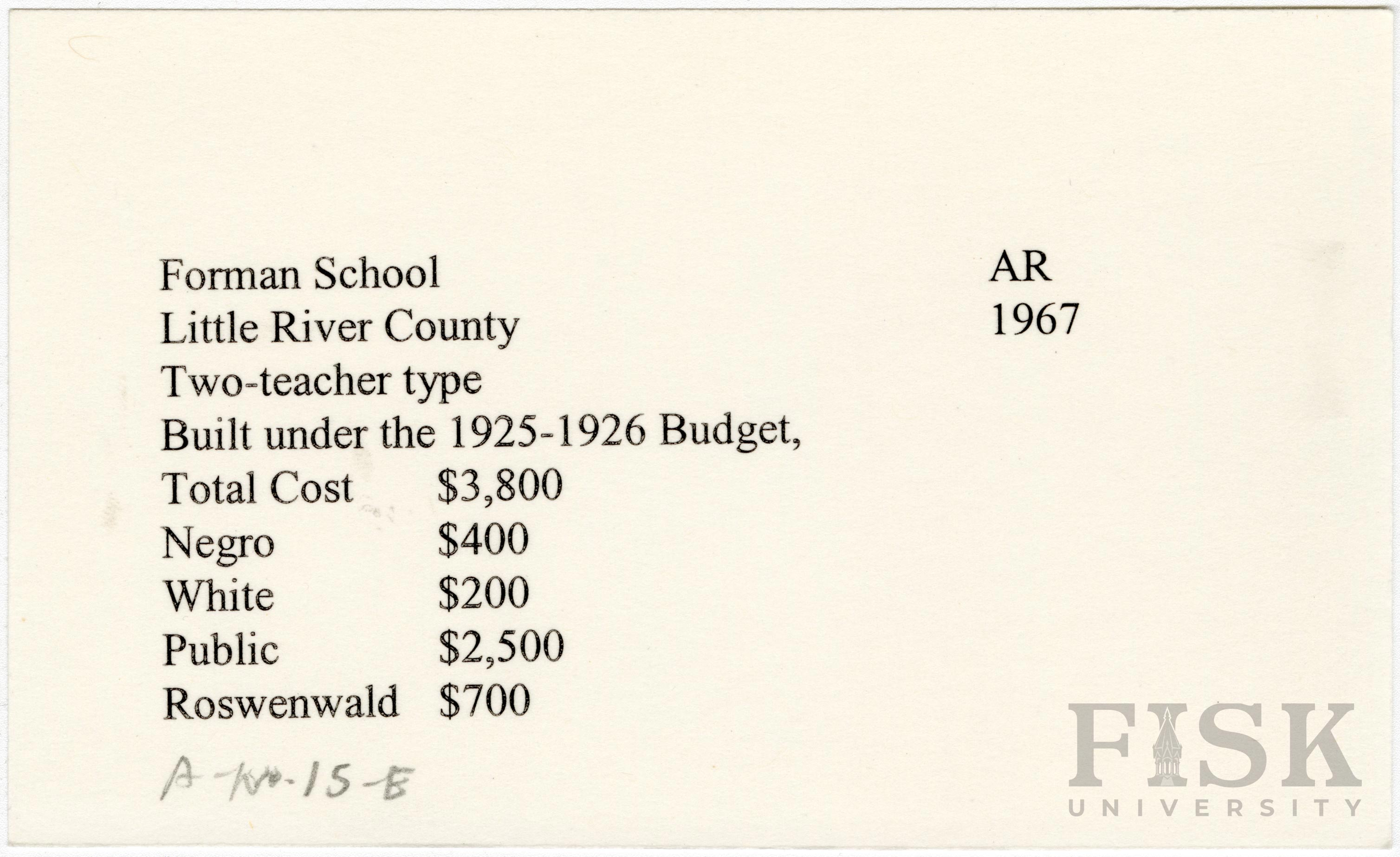 - School card from Rosenwald Fund for Forman School in Little River County, Arkansas