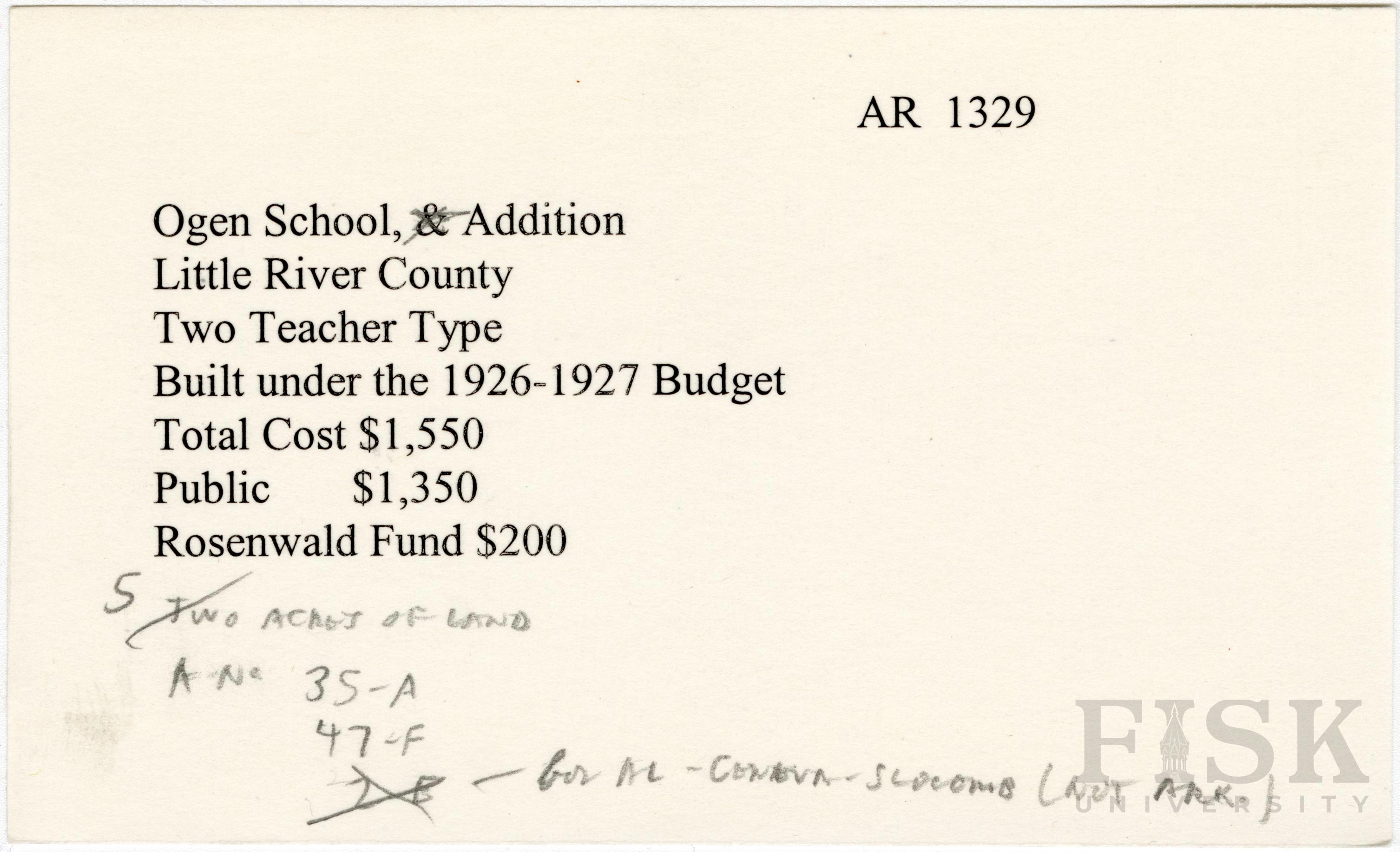 - School card from Rosenwald Fund for an addition to Ogen School in Little River County, Arkansas