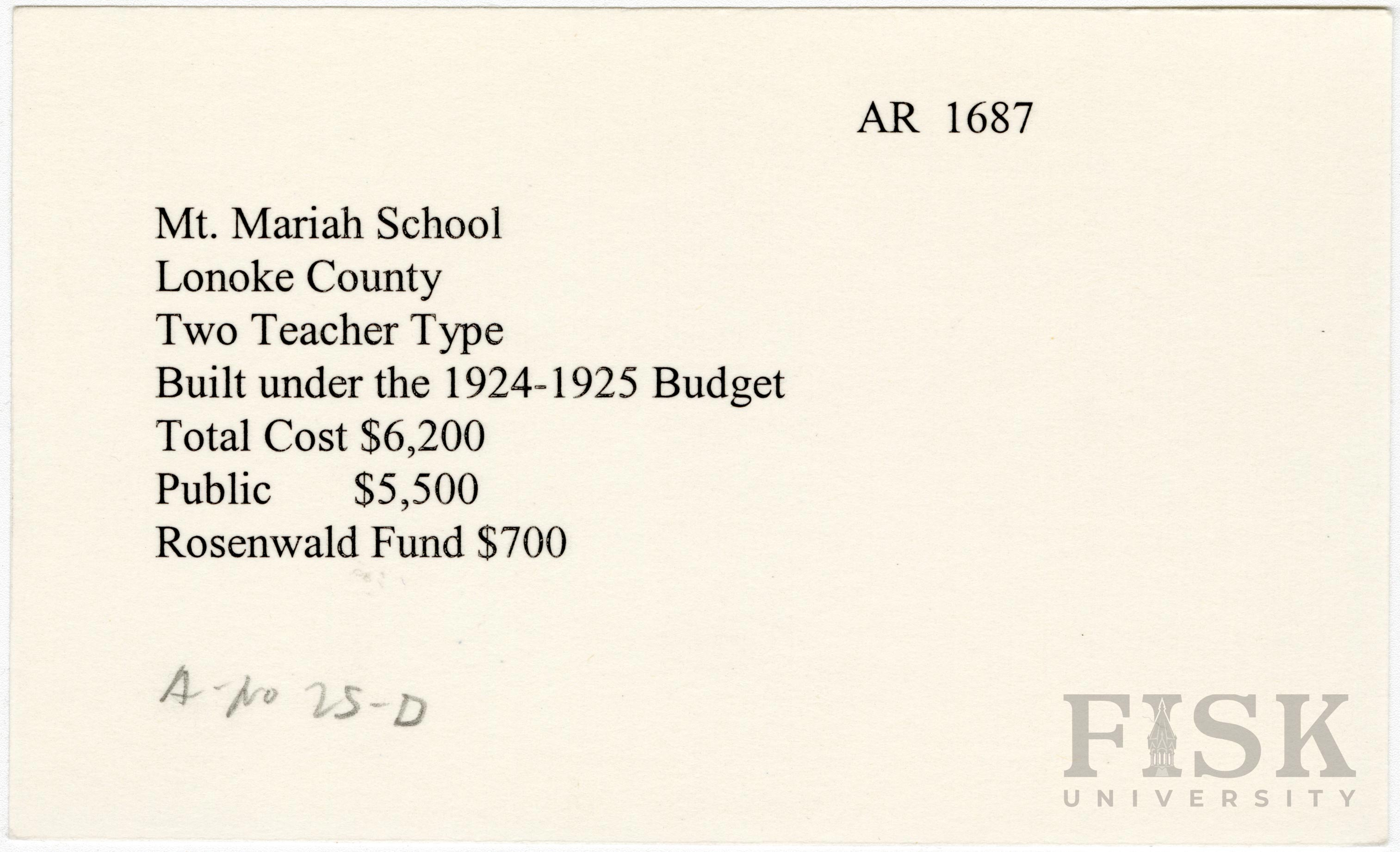 - School card from Rosenwald Fund for Mt. Mariah School in Lonoke County, Arkansas