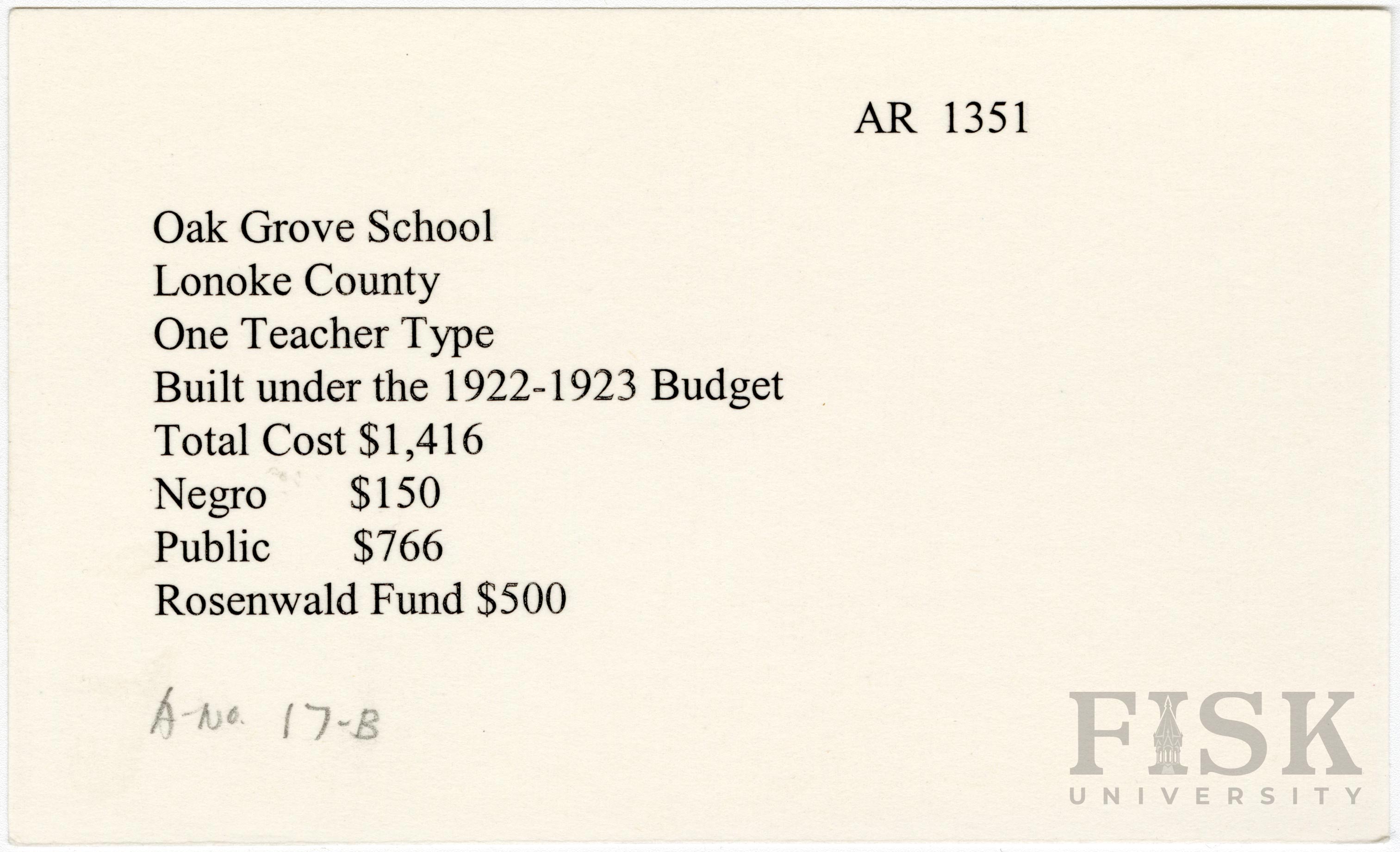 - School card from Rosenwald Fund for Oak Grove School in Lonoke County, Arkansas