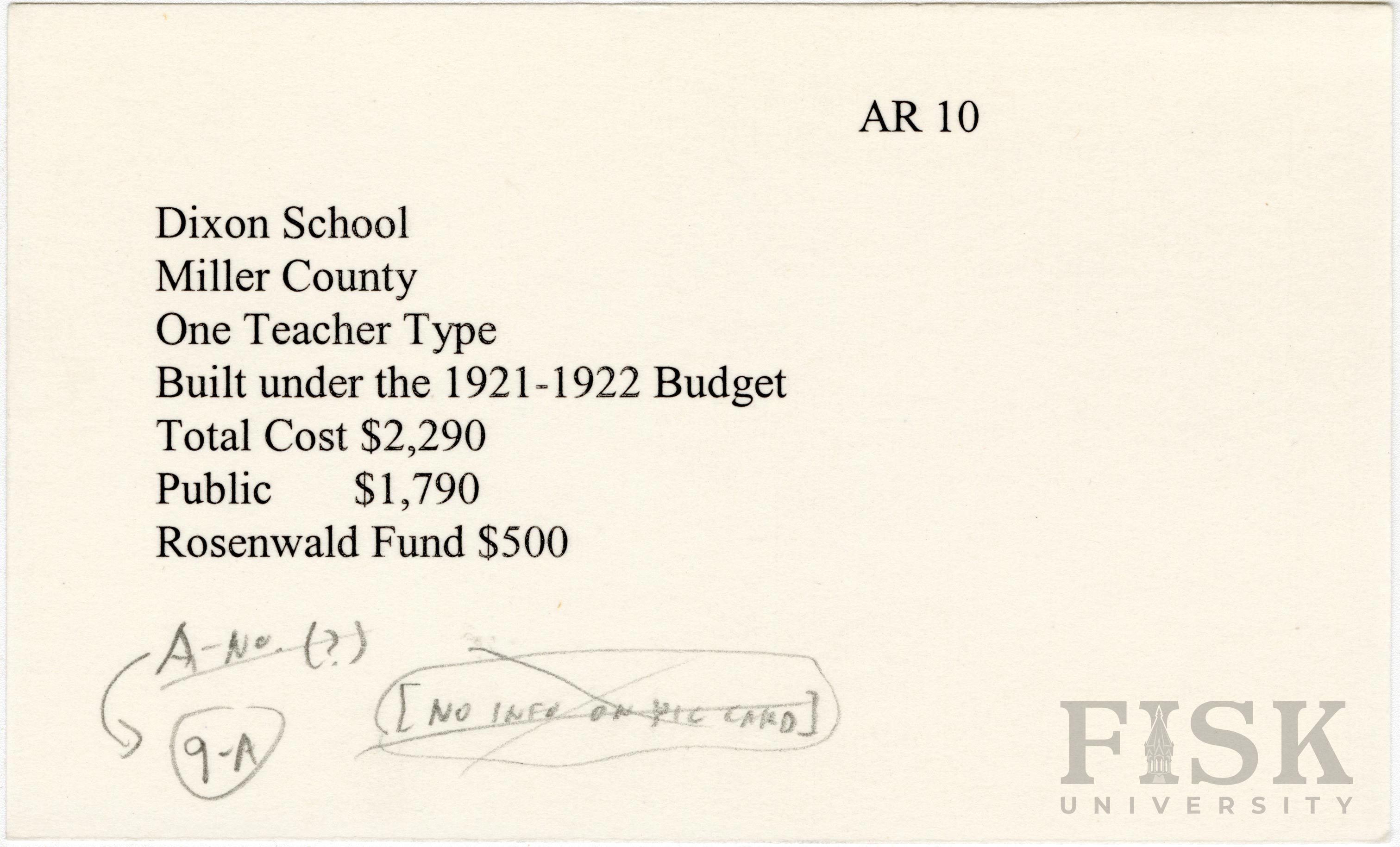 - School card from Rosenwald Fund for Dixon School in Miller County, Arkansas