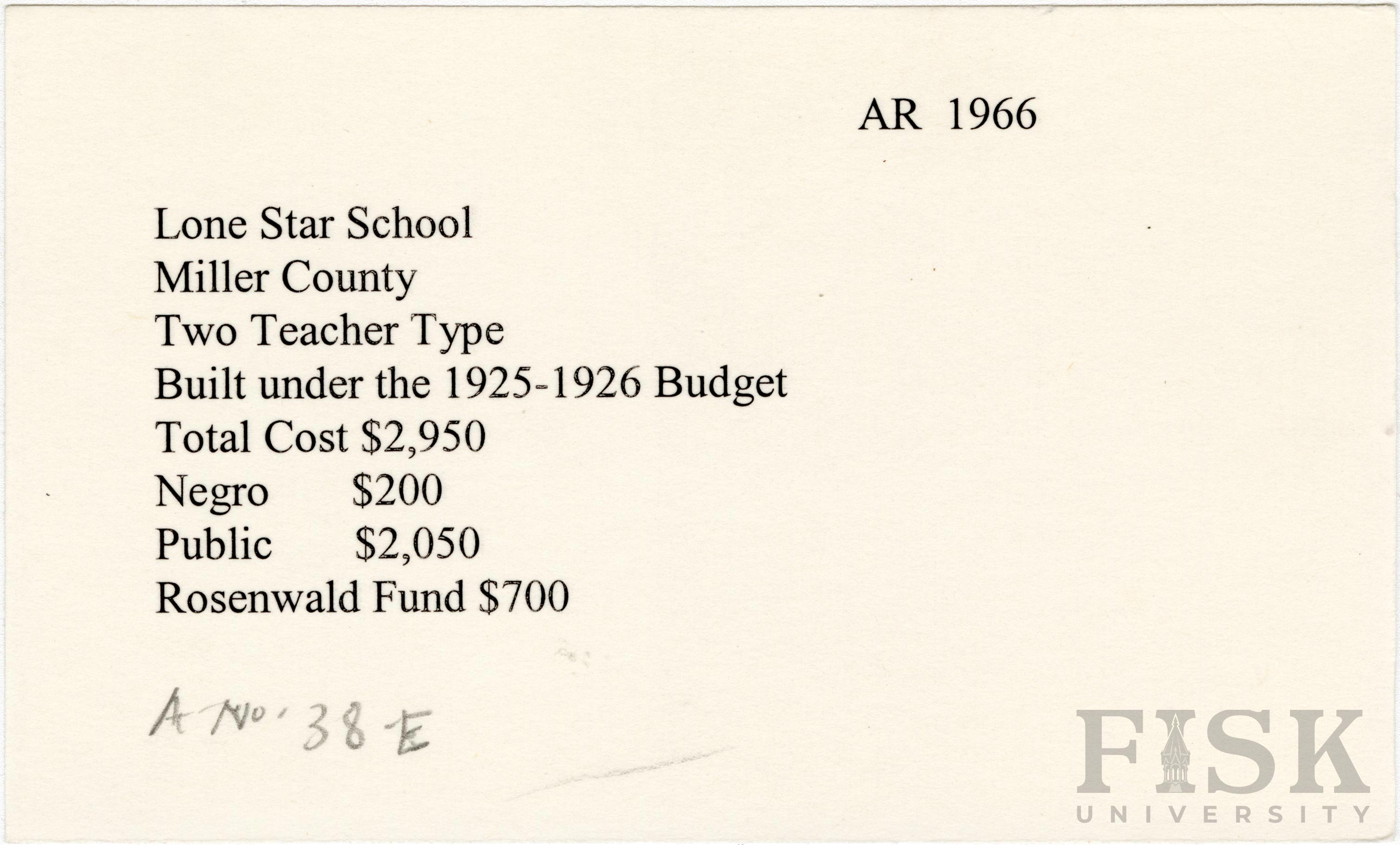 - School card from Rosenwald Fund for Lone Star School in Miller County, Arkansas