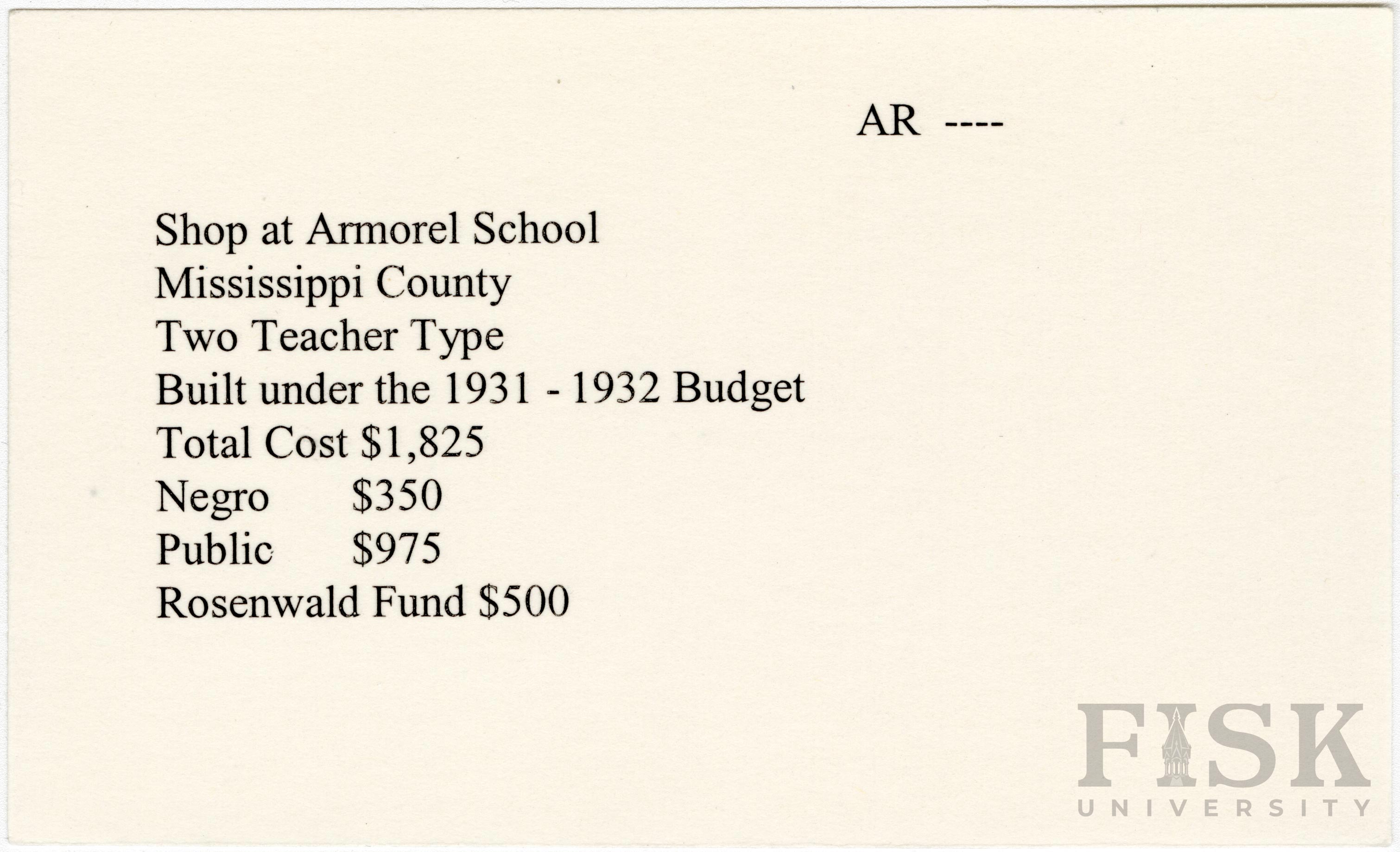 School card from Rosenwald Fund for the shop at Armorel School in Mississippi County, Arkansas