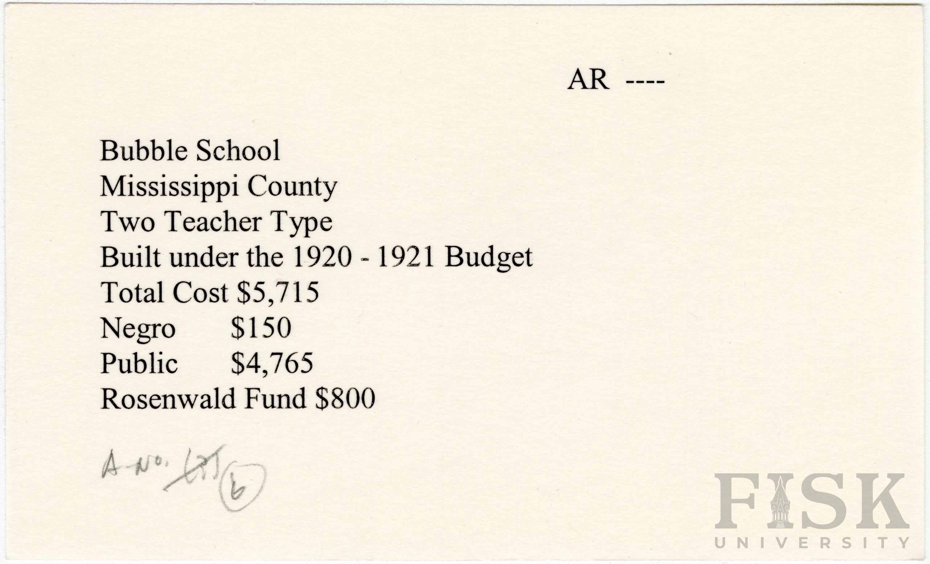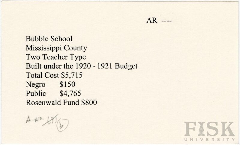 - School card from Rosenwald Fund for Bubble School in Mississippi County, Arkansas