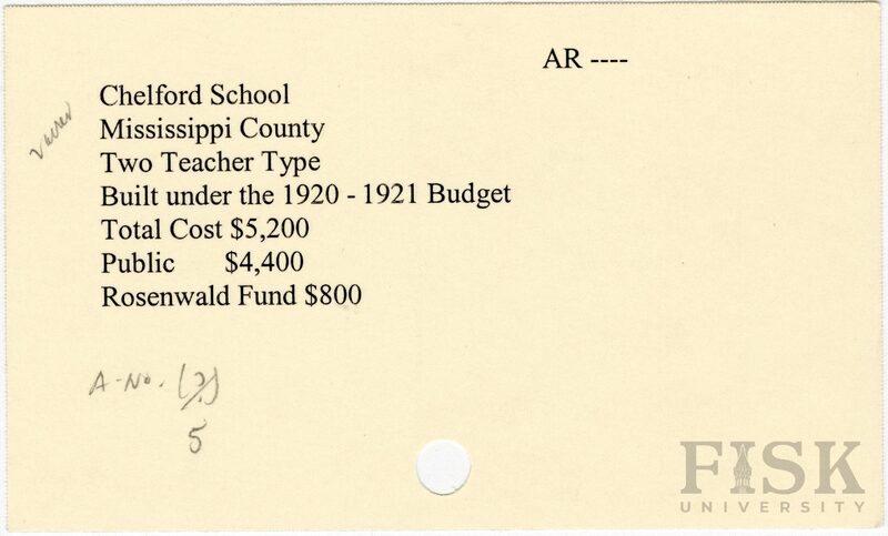 - School card from Rosenwald Fund for Chelford School in Mississippi County, Arkansas