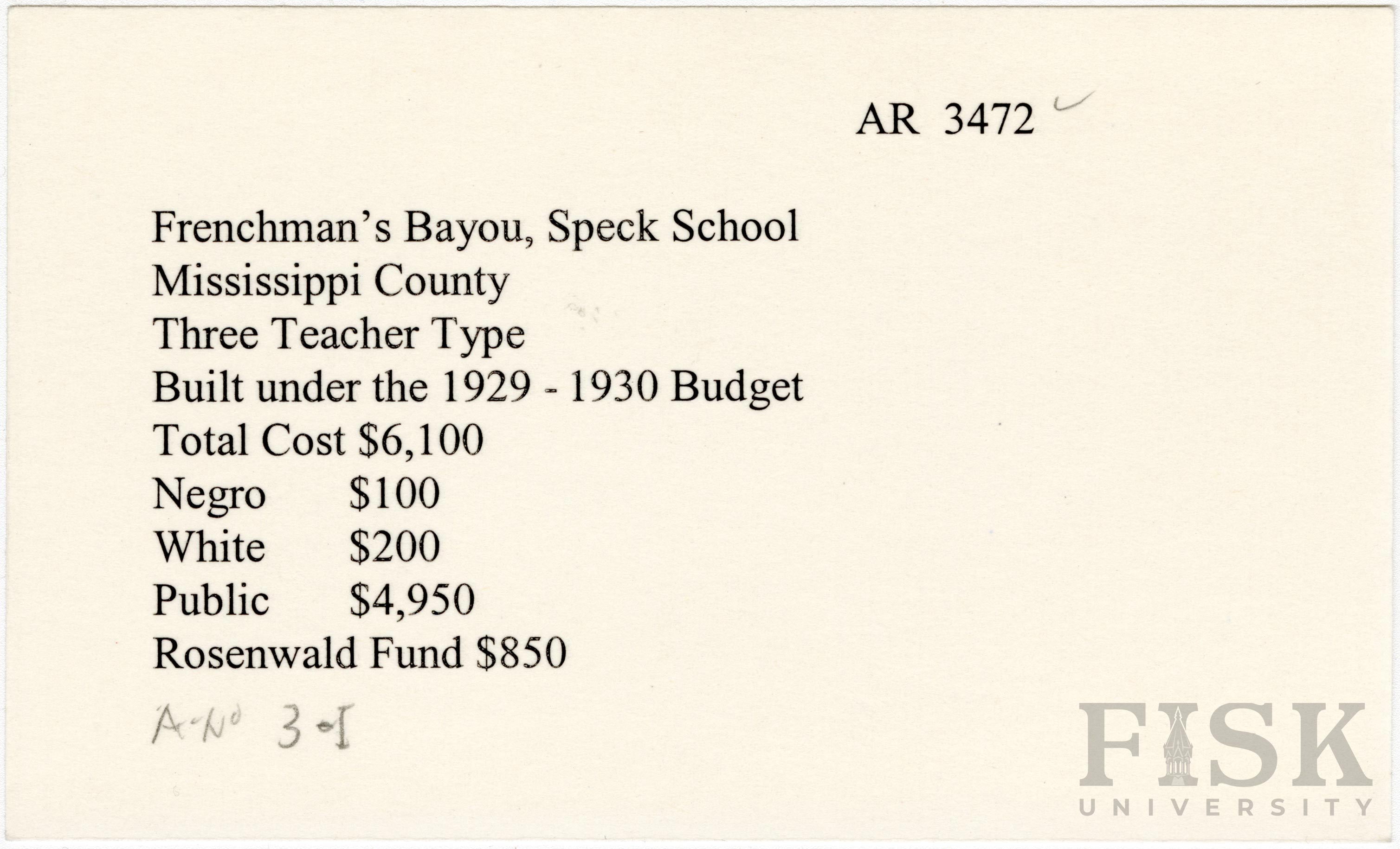 - School card from Rosenwald Fund for Frenchman's Bayou School in Mississippi County, Arkansas