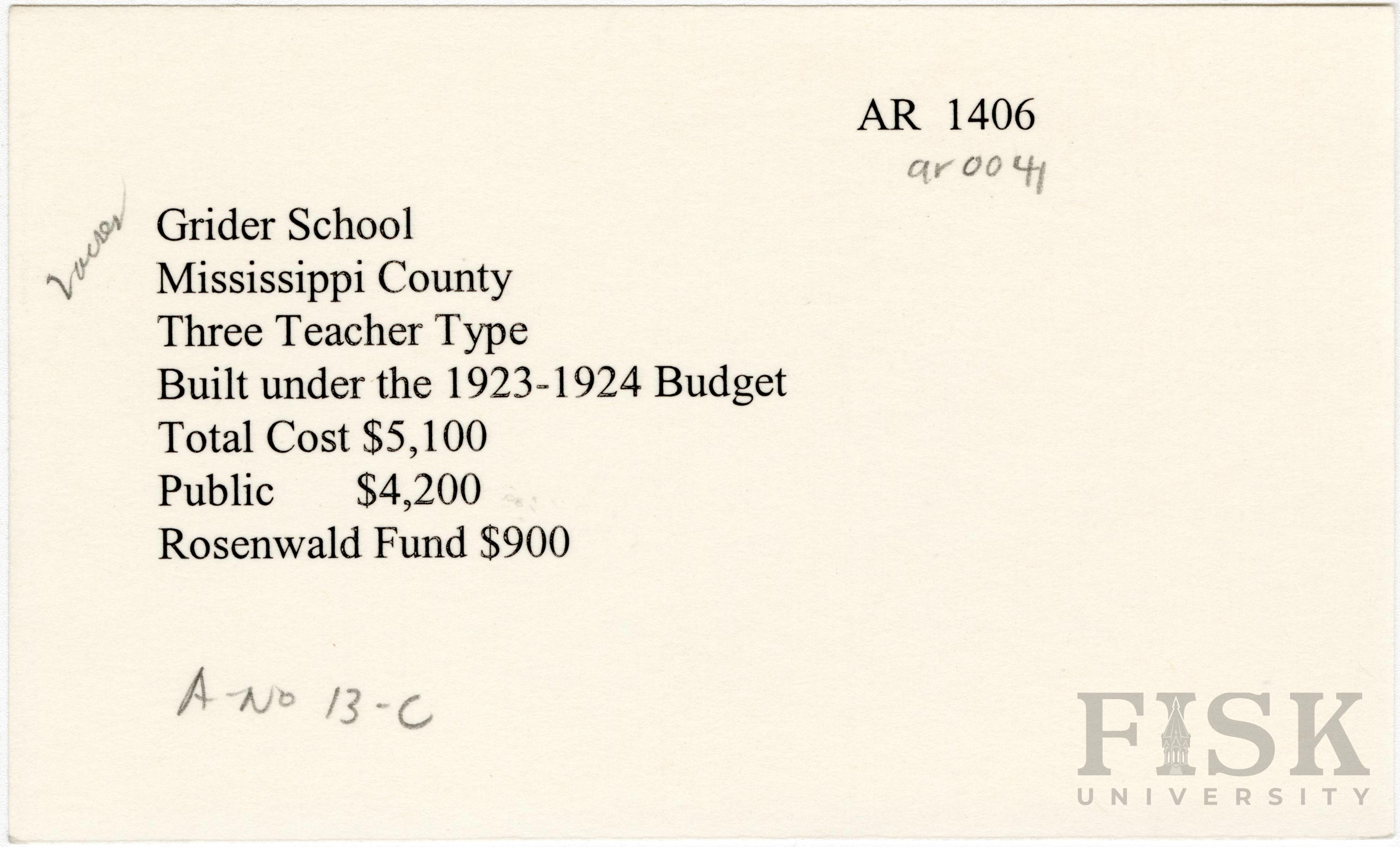 - School card from Rosenwald Fund for Grider School in Mississippi County, Arkansas