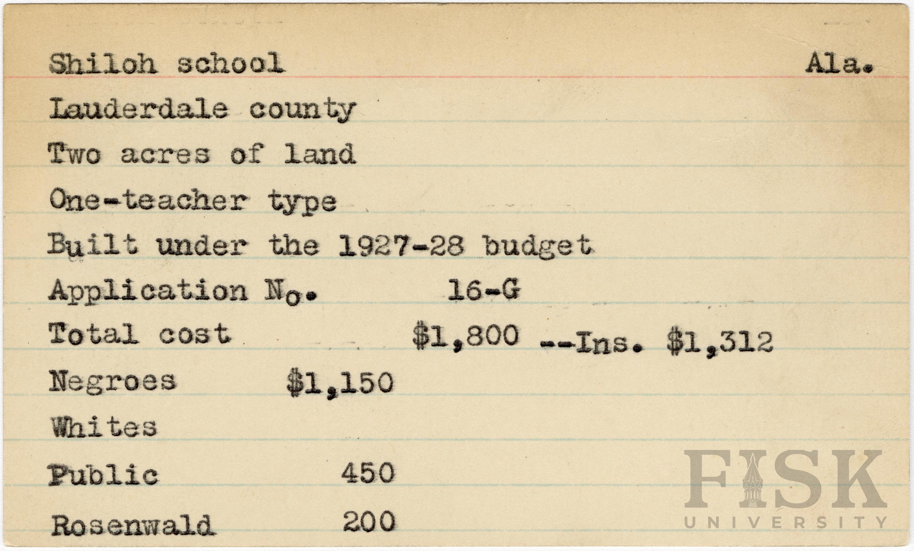 - School card from Rosenwald Fund for Shiloh School in Lauderdale County, Alabama with a section added to the budget contributions that says, "Ins. $1,312"