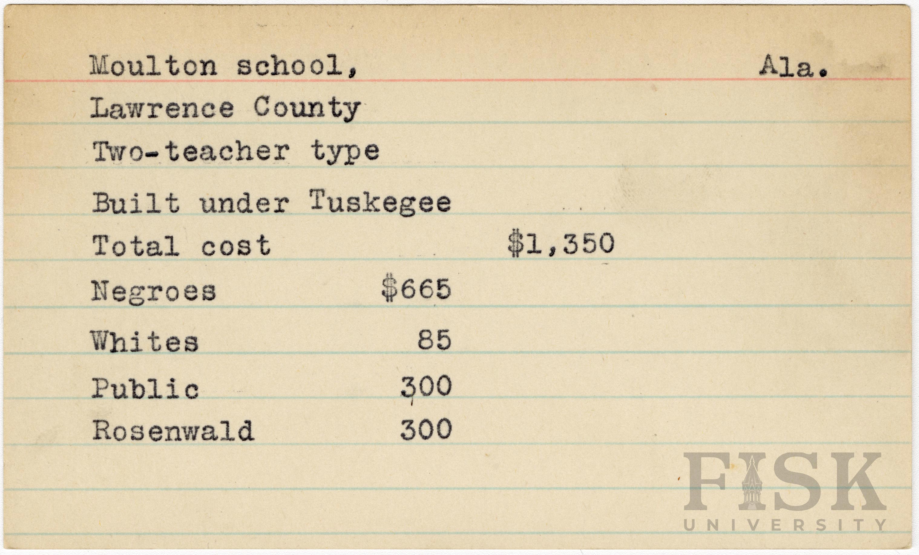 - School card from Rosenwald Fund for Moulton School in Lawrence County, Alabama