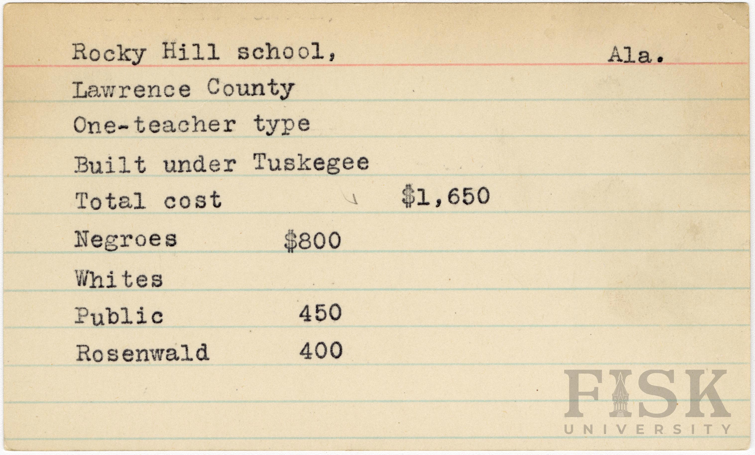 - School card from Rosenwald Fund for Rocky Hill School in Lawrence County, Alabama