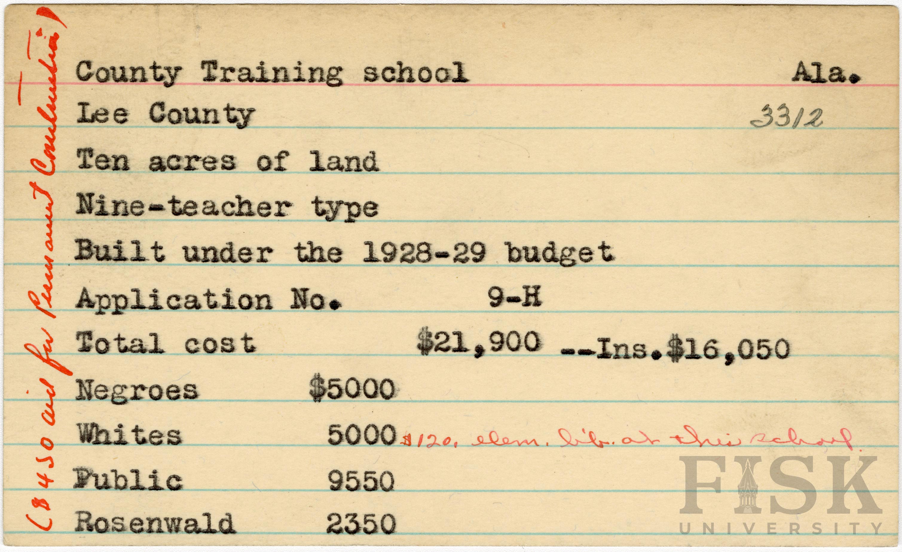 - School card from Rosenwald Fund for County Training School in Lee County, Alabama with a handwritten note on the far left and beside the budget contributions. The budget contribution note says, "$120 elem. lib. at this school"