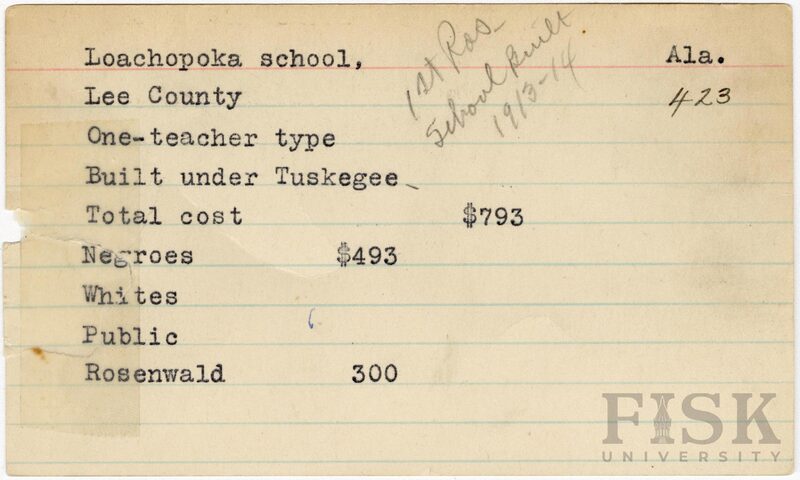 - School card from Rosenwald Fund for Loachopoka School, Alabama with a handwritten note at the top that says, "1st Ros school built 1913-14"