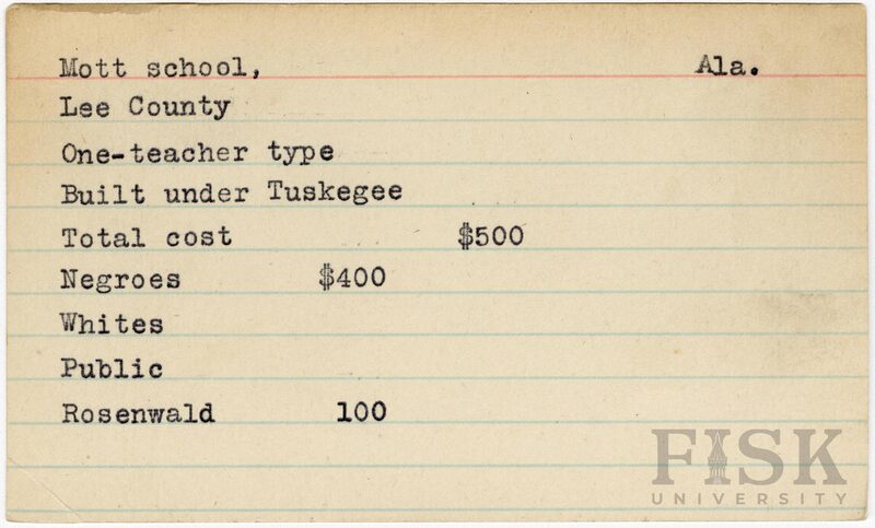 - School card from Rosenwald Fund for Mott School in Lee County, Alabama