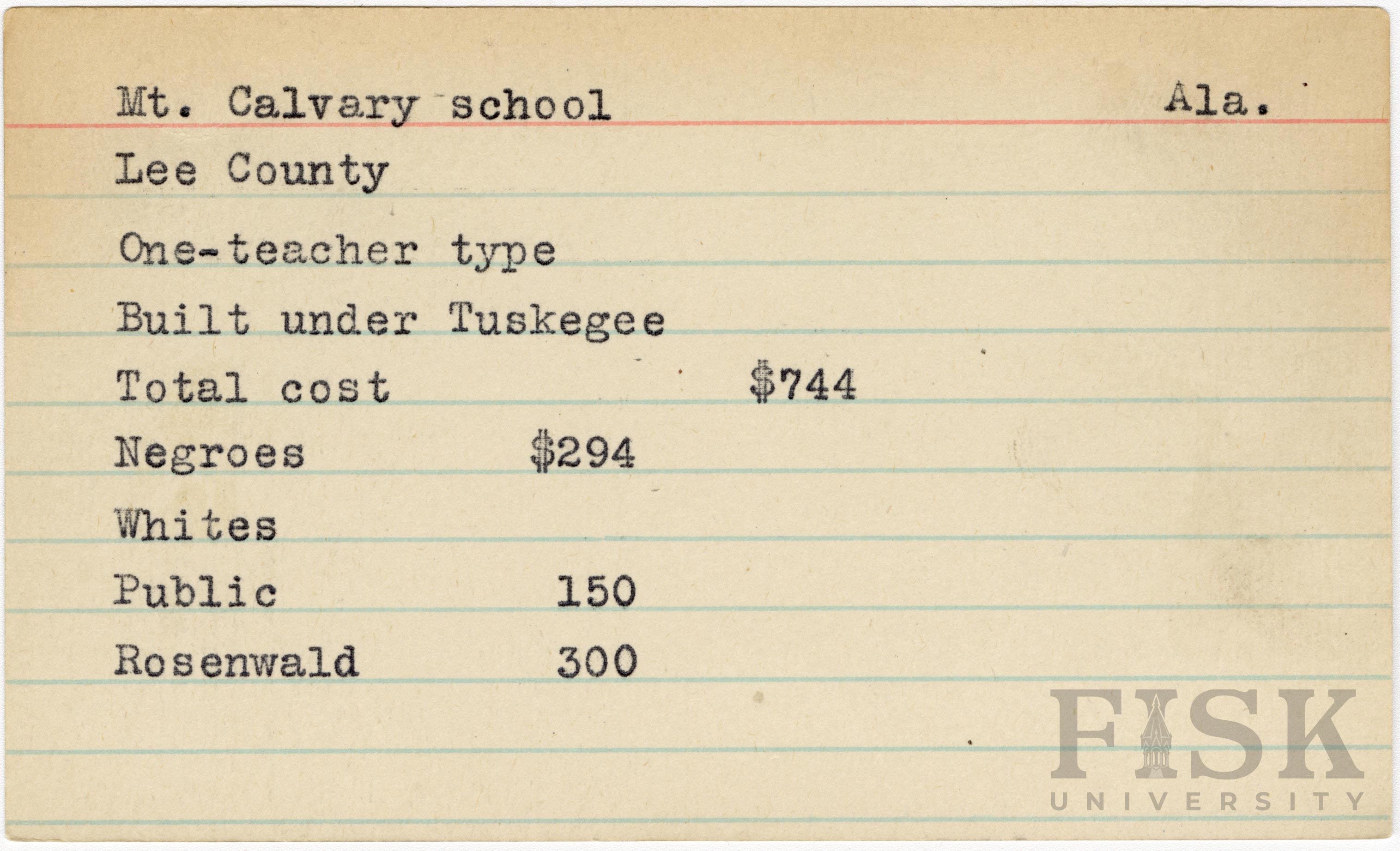 - School card from Rosenwald Fund for Mt. Calvary School in Lee County, Alabama