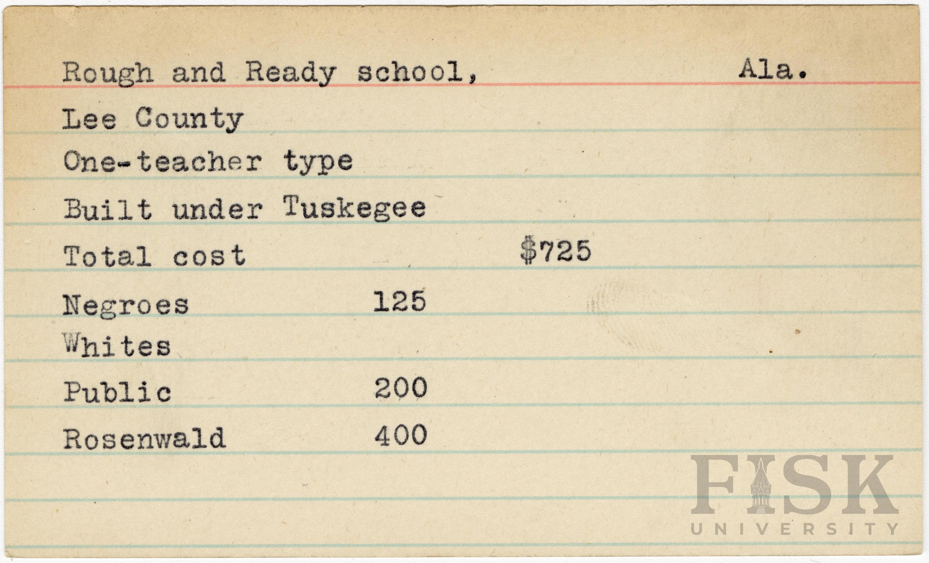 - School card from Rosenwald Fund for Rough and Ready School in Lee County, Alabama