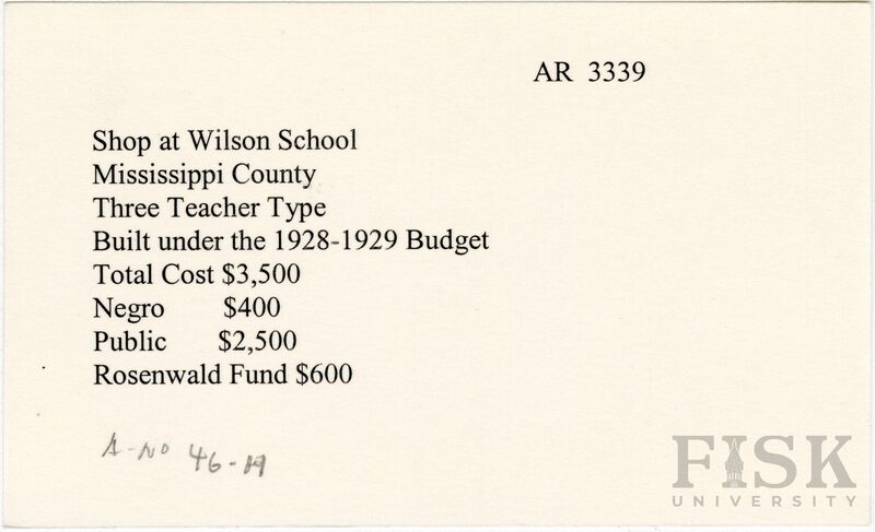 - School card from Rosenwald Fund for the shop at Wilson School in Mississippi County, Arkansas