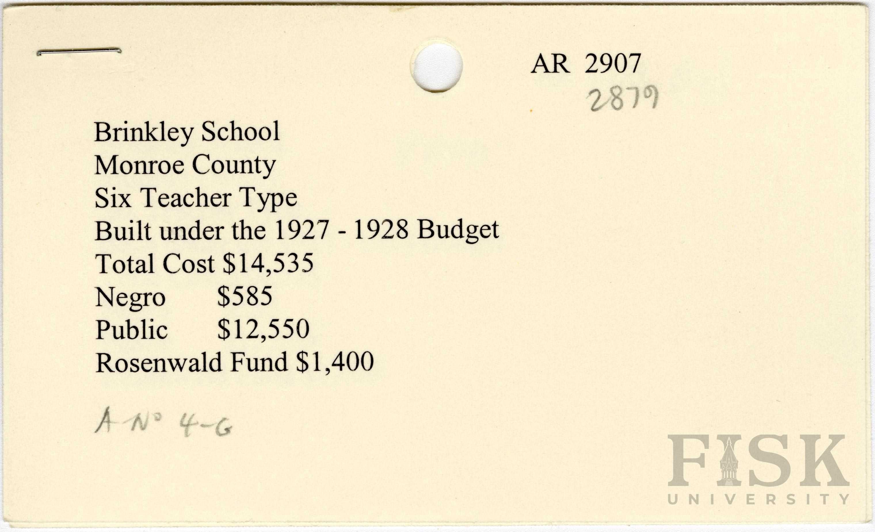 - School card from Rosenwald Fund for Brinkley School in Monroe County, Arkansas