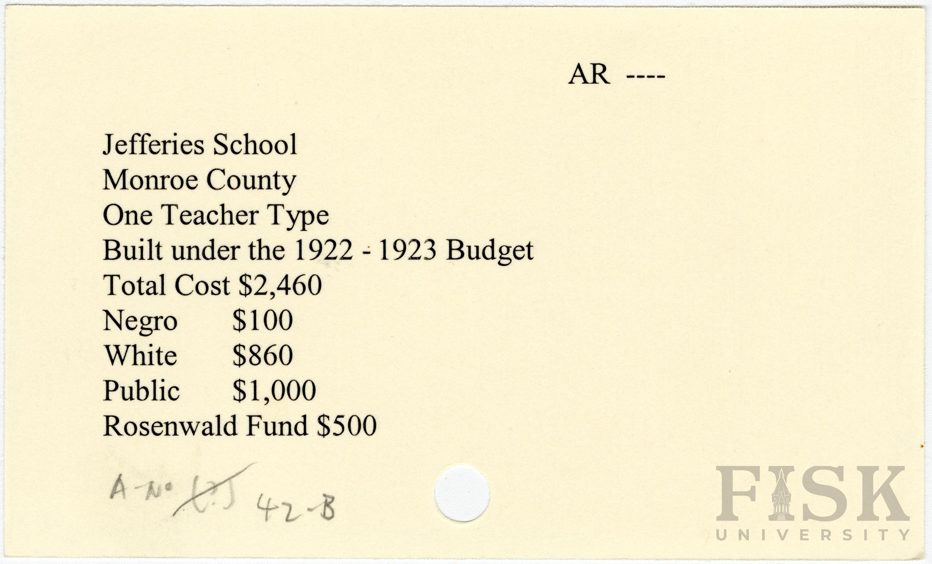 - School card from Rosenwald Fund for Jefferies School in Monroe County, Arkansas