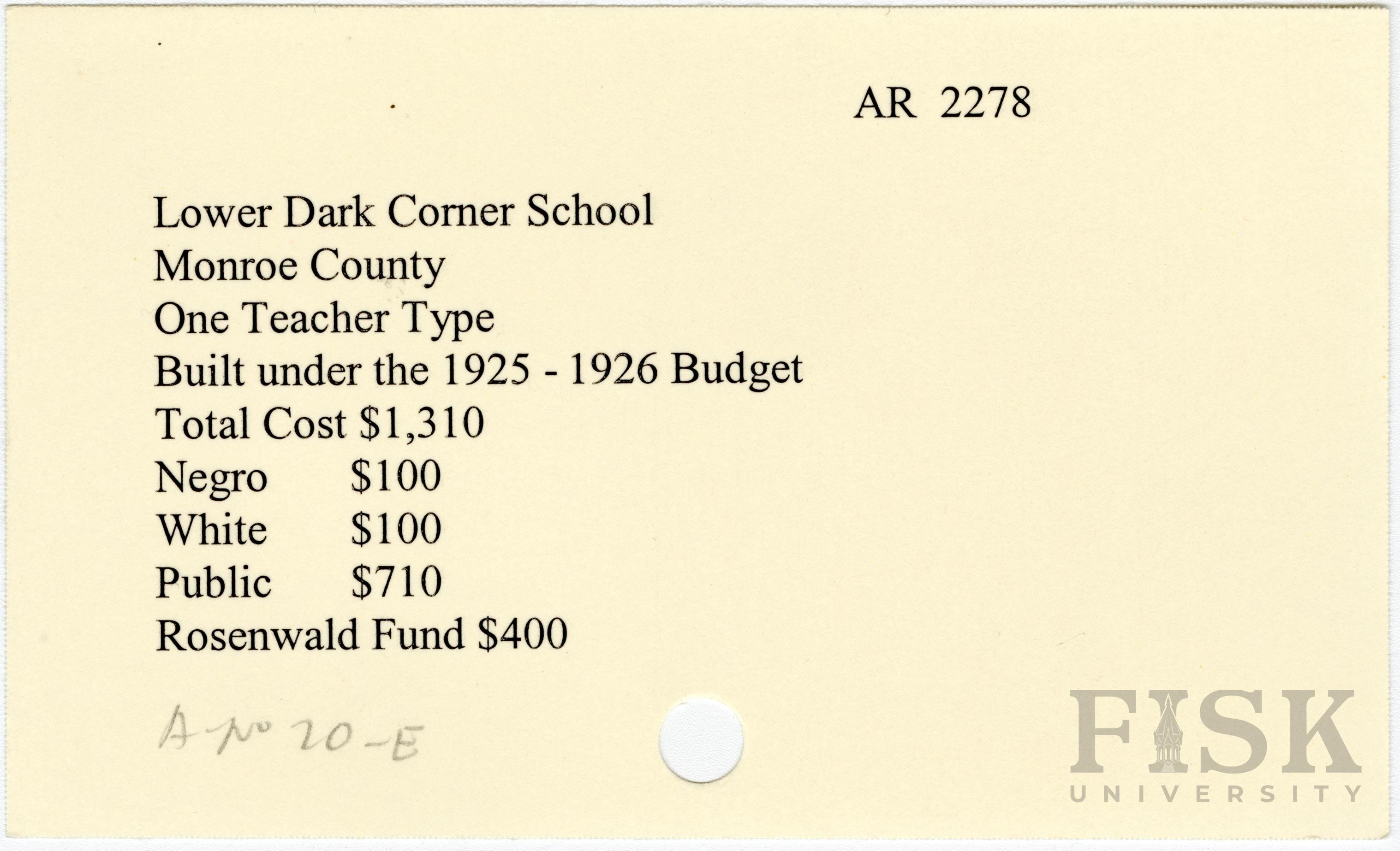 School card from Rosenwald Fund for Lower Dark Corner School in Monroe County, Arkansas