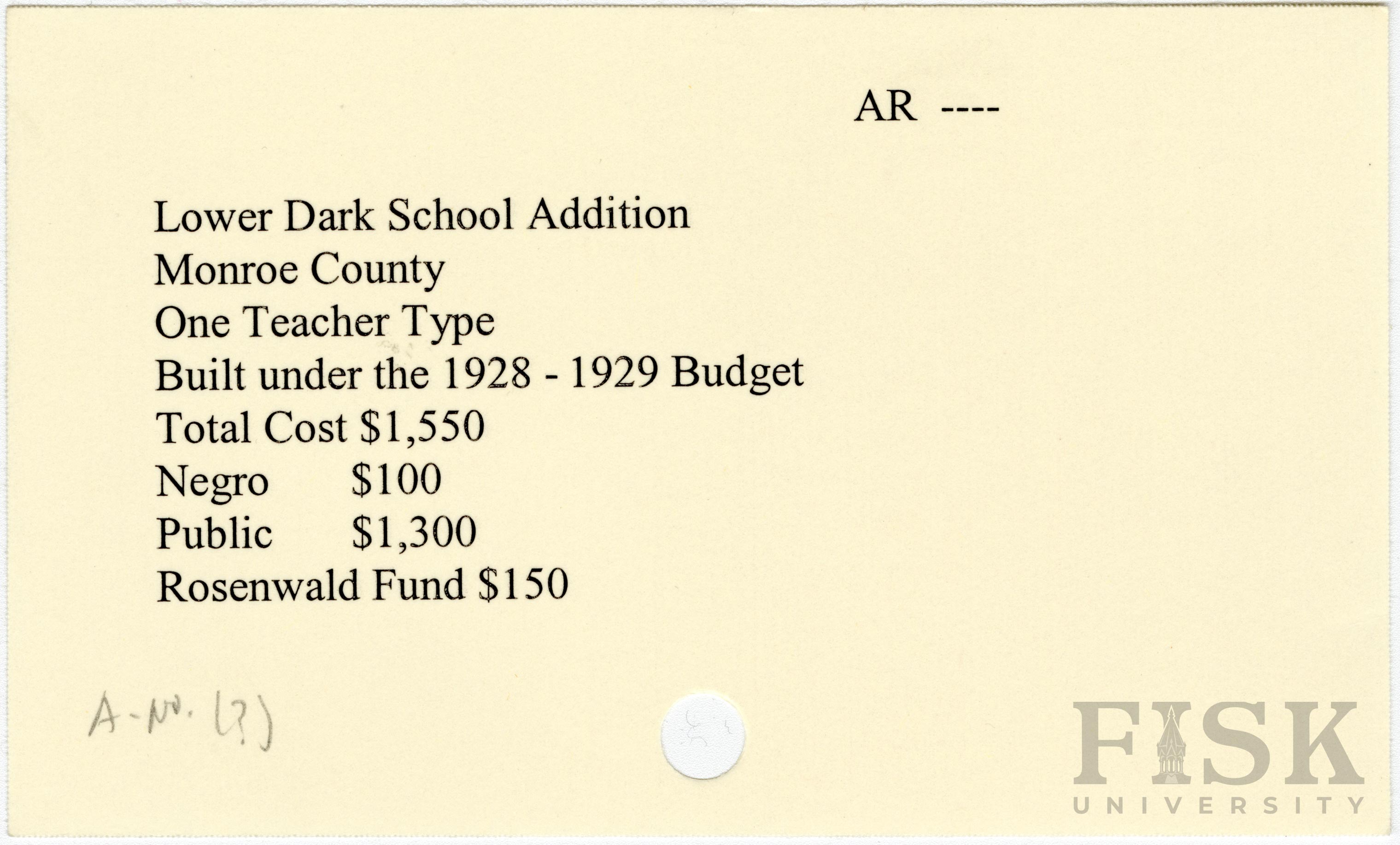 - School card from Rosenwald Fund for an addition to Lower Dark Corner School in Monroe County, Arkansas
