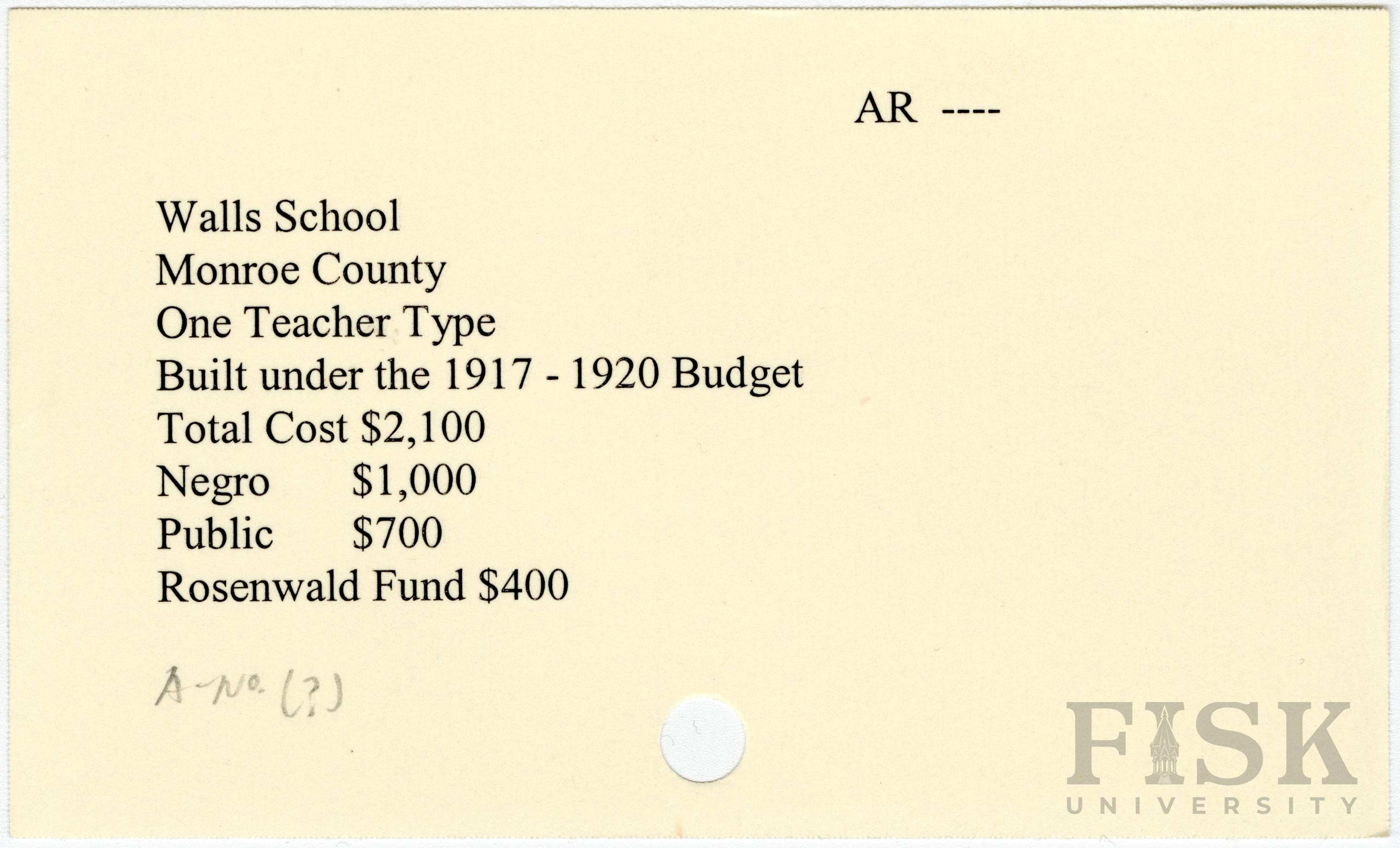 - School card from Rosenwald Fund for Walls School in Monroe County, Arkansas