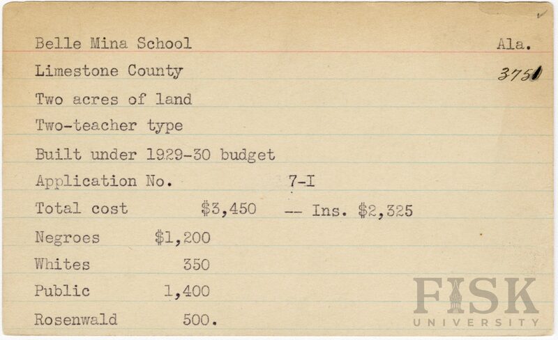 School card from Rosenwald Fund for Belle Mina School in Limestone County, Alabama with a section added to the budget contributions that says, "Ins. $2,325"