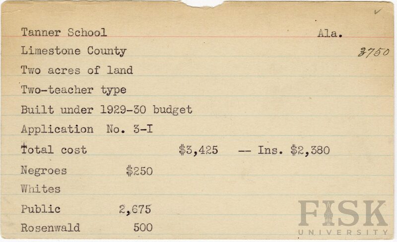 School card from Rosenwald Fund for Tanner School in Limestone County, Alabama with a section added to the budget contributions that says, "Ins. $2,380"