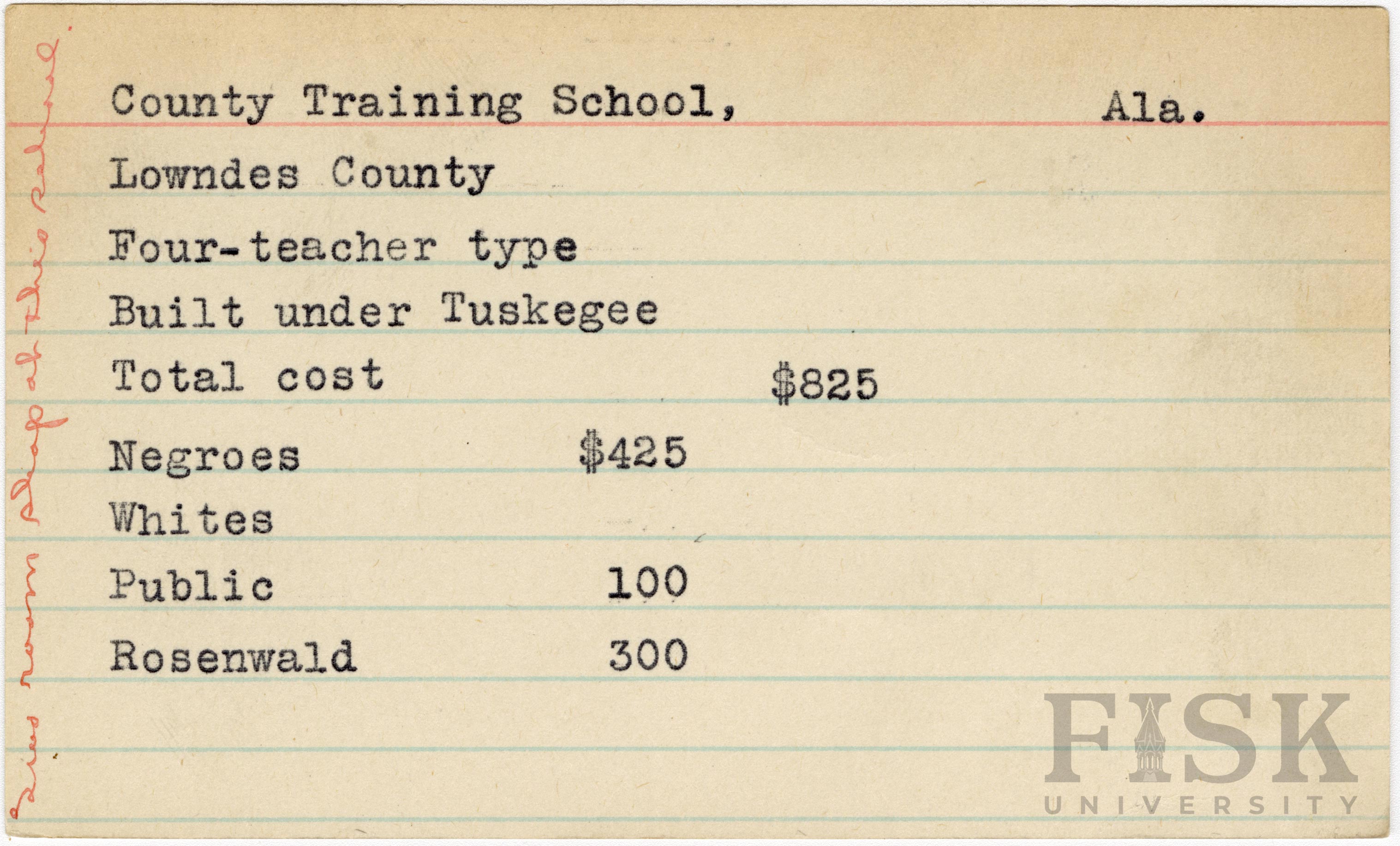 - School card from Rosenwald Fund for County Training School in Lowndes County, Alabama with a handwritten note on the far left that says, "two room shop at this school"