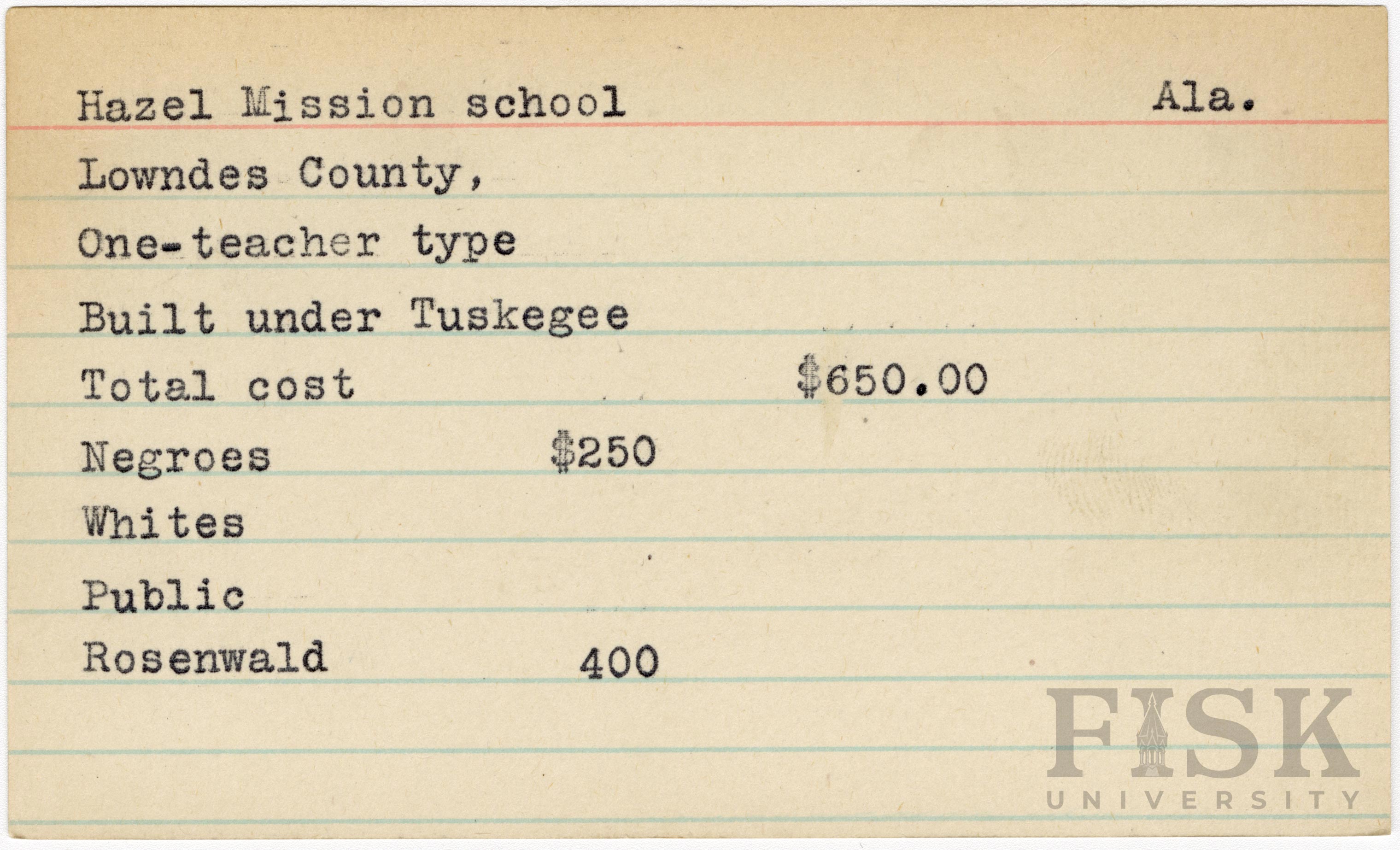 - School card from Rosenwald Fund for Hazel Mission School in Lowndes County, Alabama