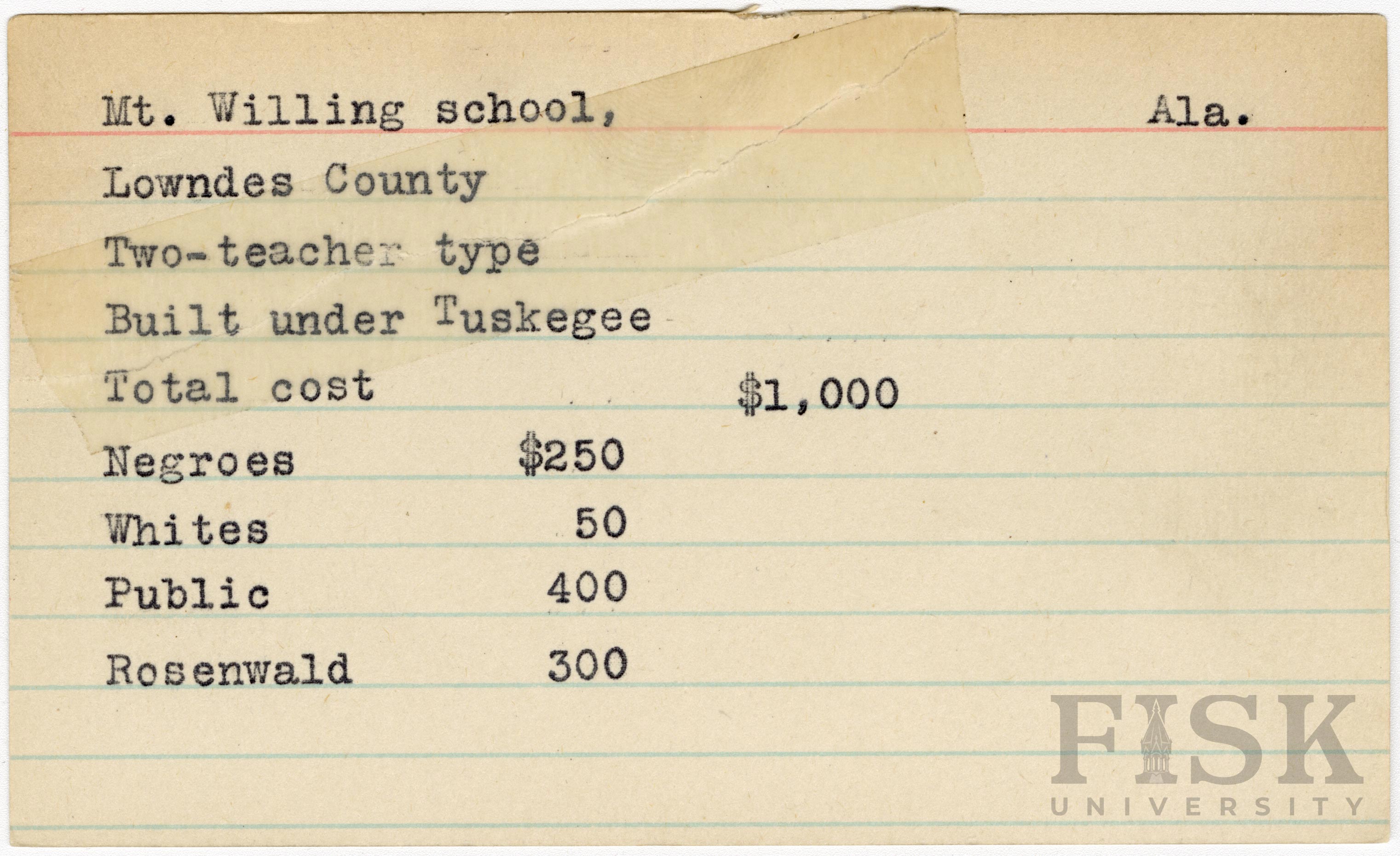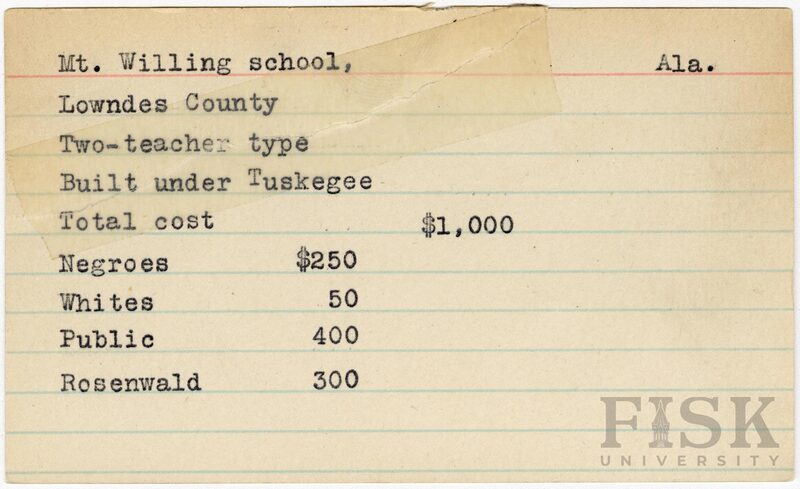 - School card from Rosenwald Fund for Mt. Willing School in Lowndes County, Alabama
