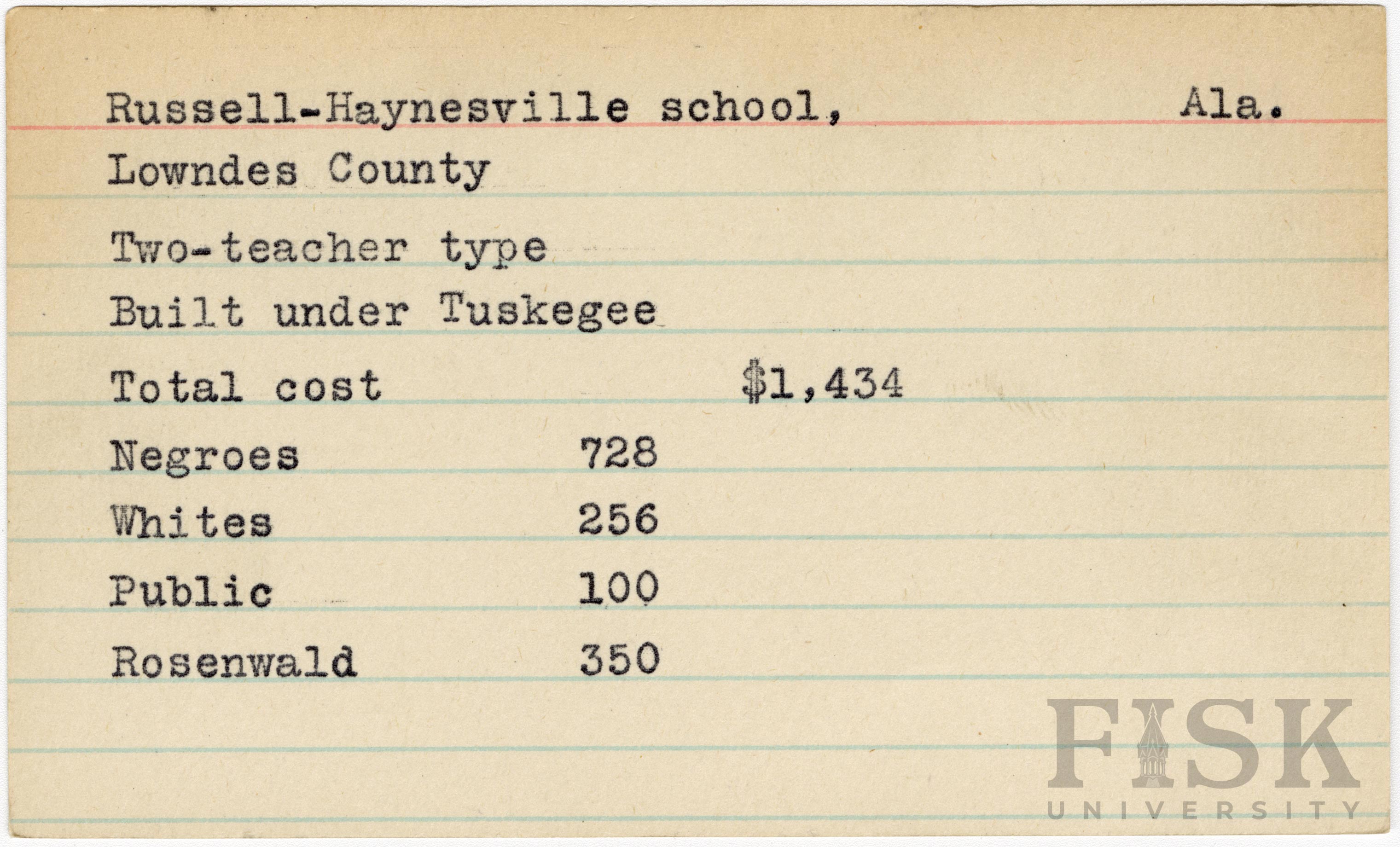 - School card from Rosenwald Fund for Russell-Haynesville School in Lowndes County, Alabama